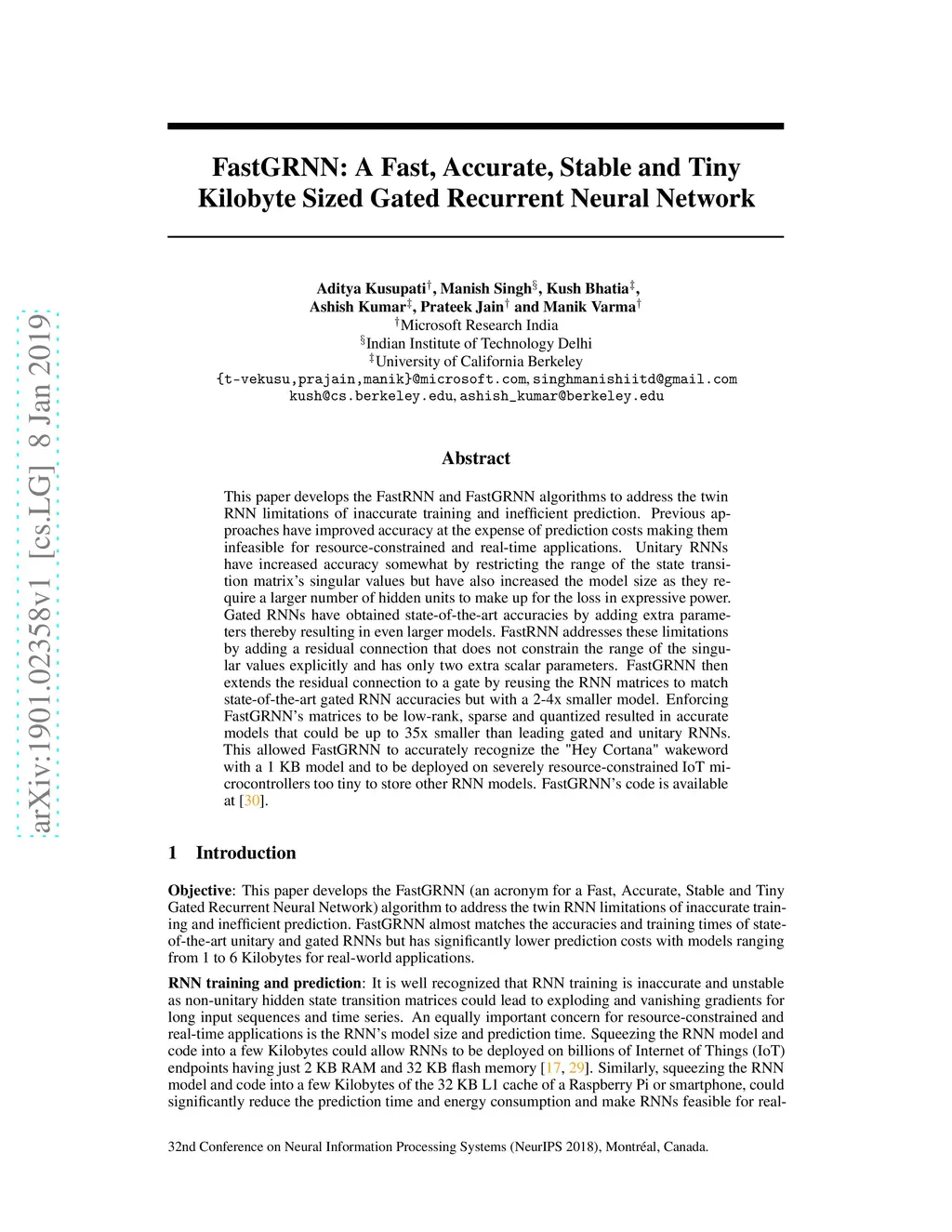 FastGRNN: A Fast, Accurate, Stable and Tiny Kilobyte Sized Gated