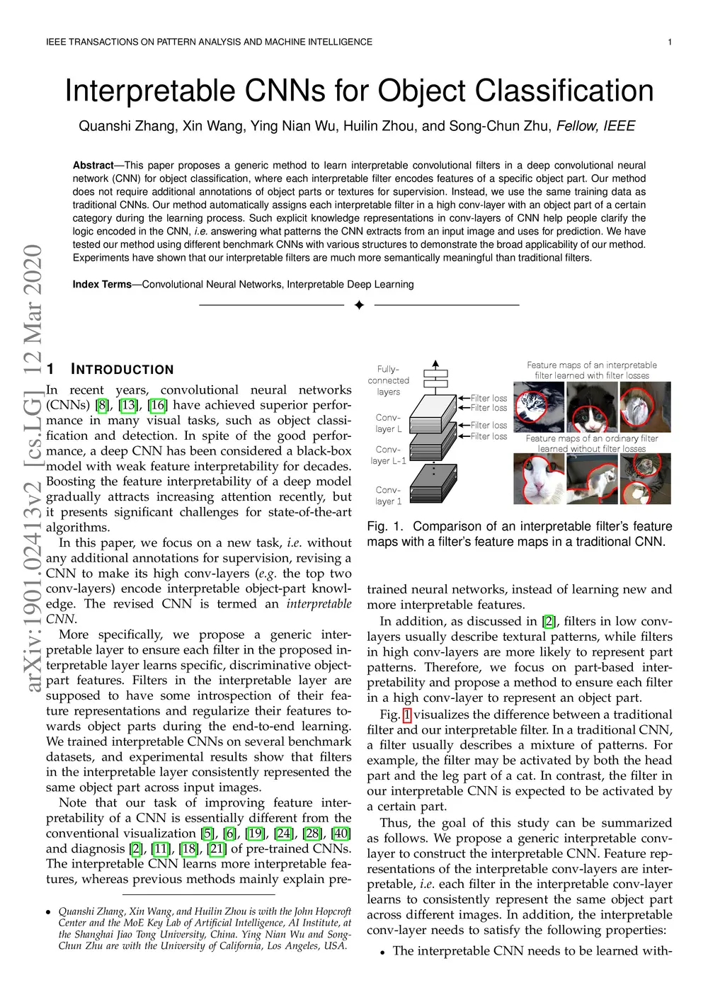 This paper proposes a generic method to learn interpretable convolutional filters in a deep convolutional neural network (CNN) for object classification, where each interpretable filter encodes features of a specific object part. Our method does not require additional annotations of object parts or textures for supervision. Instead, we use the same training data as traditional CNNs. Our method automatically assigns each interpretable filter in a high conv-layer with an object part of a certain category during the learning process. Such explicit knowledge representations in conv-layers of CNN help people clarify the logic encoded in the CNN, i.e., answering what patterns the CNN extracts from an input image and uses for prediction. We have tested our method using different benchmark CNNs with various structures to demonstrate the broad applicability of our method. Experiments have shown that our interpretable filters are much more semantically meaningful than traditional filters.