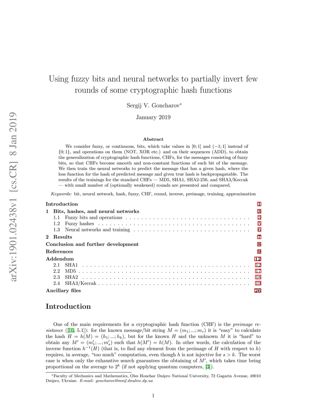 We consider fuzzy, or continuous, bits, which take values in [0;1] and (-1;1] instead of {0;1}, and operations on them (NOT, XOR etc.) and on their sequences (ADD), to obtain the generalization of cryptographic hash functions, CHFs, for the messages consisting of fuzzy bits, so that CHFs become smooth and non-constant functions of each bit of the message. We then train the neural networks to predict the message that has a given hash, where the loss function for the hash of predicted message and given true hash is backpropagatable. The results of the trainings for the standard CHFs - MD5, SHA1, SHA2-256, and SHA3/Keccak - with small number of (optionally weakened) rounds are presented and compared.