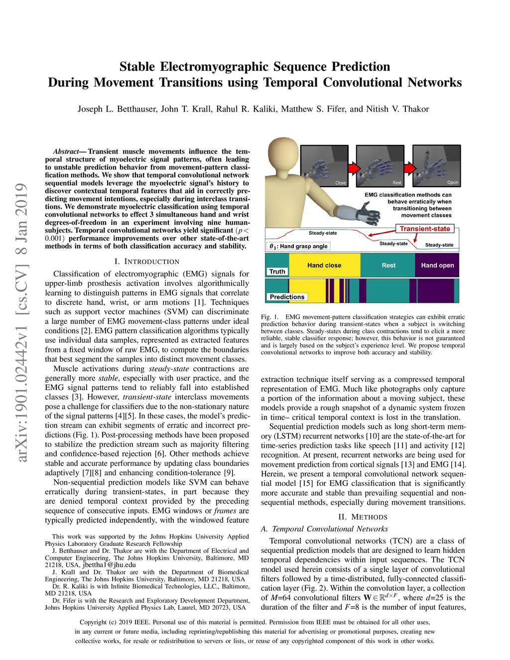 Transient muscle movements influence the temporal structure of myoelectric signal patterns, often leading to unstable prediction behavior from movement-pattern classification methods. We show that temporal convolutional network sequential models leverage the myoelectric signal's history to discover contextual temporal features that aid in correctly predicting movement intentions, especially during interclass transitions. We demonstrate myoelectric classification using temporal convolutional networks to effect 3 simultaneous hand and wrist degrees-of-freedom in an experiment involving nine human-subjects. Temporal convolutional networks yield significant performance improvements over other state-of-the-art methods in terms of both classification accuracy and stability.