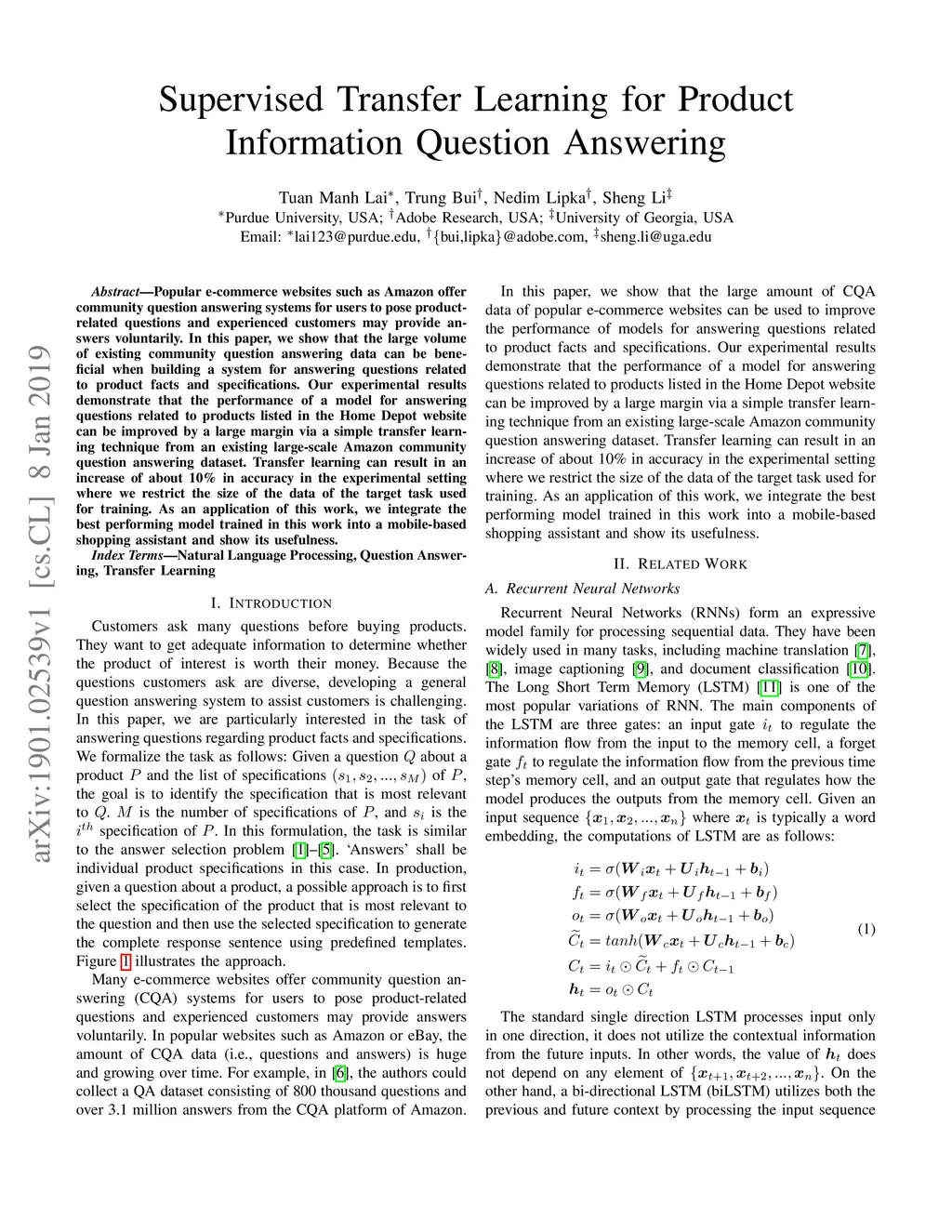 Popular e-commerce websites such as Amazon offer community question answering systems for users to pose product related questions and experienced customers may provide answers voluntarily. In this paper, we show that the large volume of existing community question answering data can be beneficial when building a system for answering questions related to product facts and specifications. Our experimental results demonstrate that the performance of a model for answering questions related to products listed in the Home Depot website can be improved by a large margin via a simple transfer learning technique from an existing large-scale Amazon community question answering dataset. Transfer learning can result in an increase of about 10% in accuracy in the experimental setting where we restrict the size of the data of the target task used for training. As an application of this work, we integrate the best performing model trained in this work into a mobile-based shopping assistant and show its usefulness.