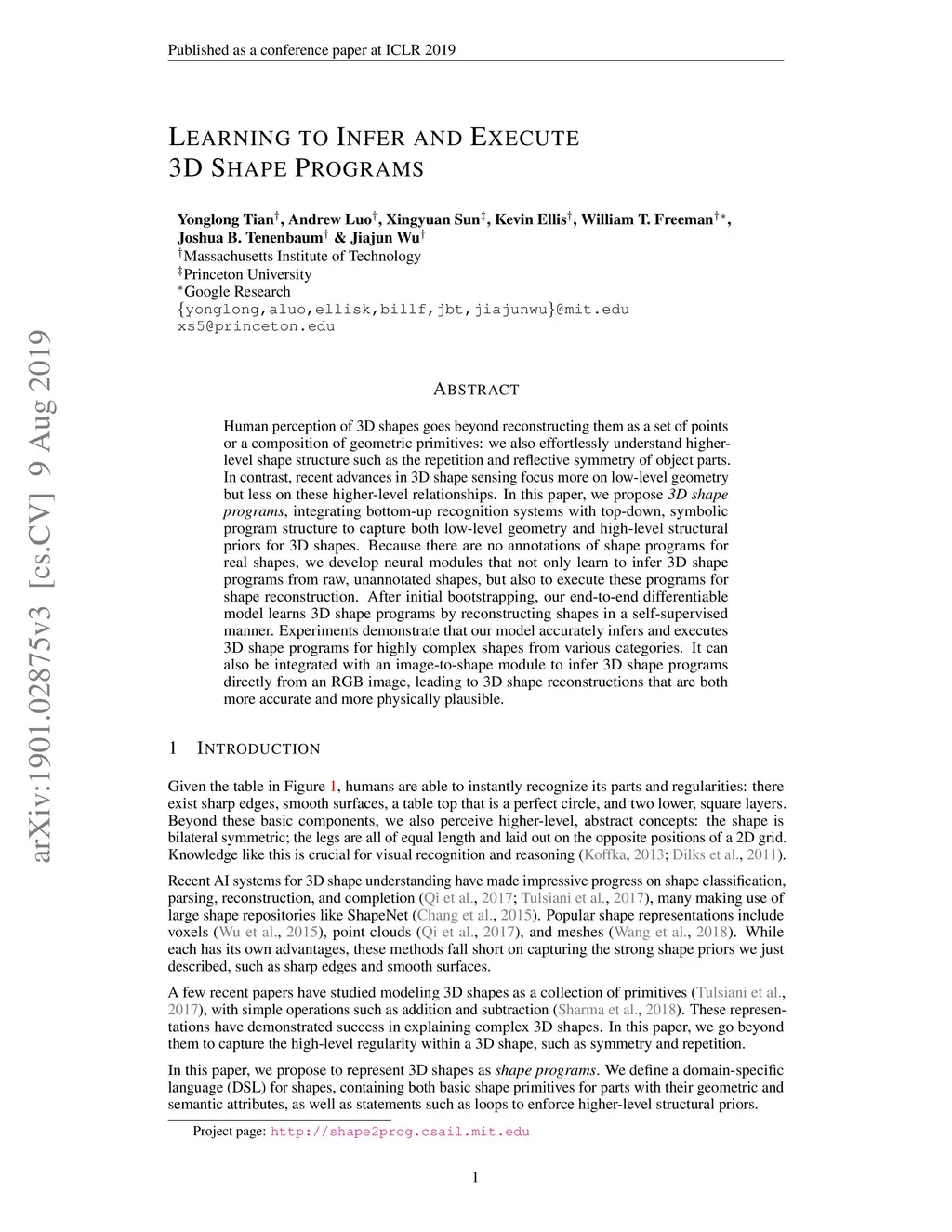 Human perception of 3D shapes goes beyond reconstructing them as a set of points or a composition of geometric primitives: we also effortlessly understand higher-level shape structure such as the repetition and reflective symmetry of object parts. In contrast, recent advances in 3D shape sensing focus more on low-level geometry but less on these higher-level relationships. In this paper, we propose 3D shape programs, integrating bottom-up recognition systems with top-down, symbolic program structure to capture both low-level geometry and high-level structural priors for 3D shapes. Because there are no annotations of shape programs for real shapes, we develop neural modules that not only learn to infer 3D shape programs from raw, unannotated shapes, but also to execute these programs for shape reconstruction. After initial bootstrapping, our end-to-end differentiable model learns 3D shape programs by reconstructing shapes in a self-supervised manner. Experiments demonstrate that our model accurately infers and executes 3D shape programs for highly complex shapes from various categories. It can also be integrated with an image-to-shape module to infer 3D shape programs directly from an RGB image, leading to 3D shape reconstructions that are both more accurate and more physically plausible.
