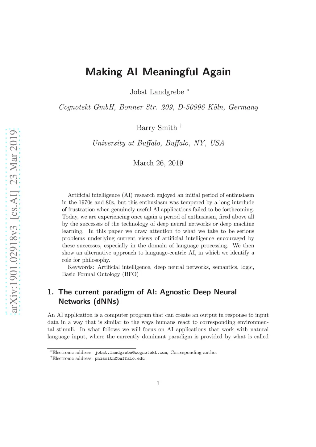 Artificial intelligence (AI) research enjoyed an initial period of enthusiasm in the 1970s and 80s. But this enthusiasm was tempered by a long interlude of frustration when genuinely useful AI applications failed to be forthcoming. Today, we are experiencing once again a period of enthusiasm, fired above all by the successes of the technology of deep neural networks or deep machine learning. In this paper we draw attention to what we take to be serious problems underlying current views of artificial intelligence encouraged by these successes, especially in the domain of language processing. We then show an alternative approach to language-centric AI, in which we identify a role for philosophy.