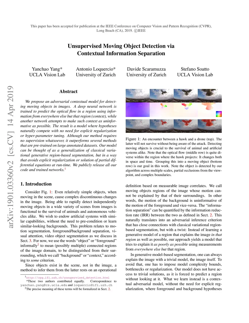 We propose an adversarial contextual model for detecting moving objects in images. A deep neural network is trained to predict the optical flow in a region using information from everywhere else but that region (context), while another network attempts to make such context as uninformative as possible. The result is a model where hypotheses naturally compete with no need for explicit regularization or hyper-parameter tuning. Although our method requires no supervision whatsoever, it outperforms several methods that are pre-trained on large annotated datasets. Our model can be thought of as a generalization of classical variational generative region-based segmentation, but in a way that avoids explicit regularization or solution of partial differential equations at run-time.