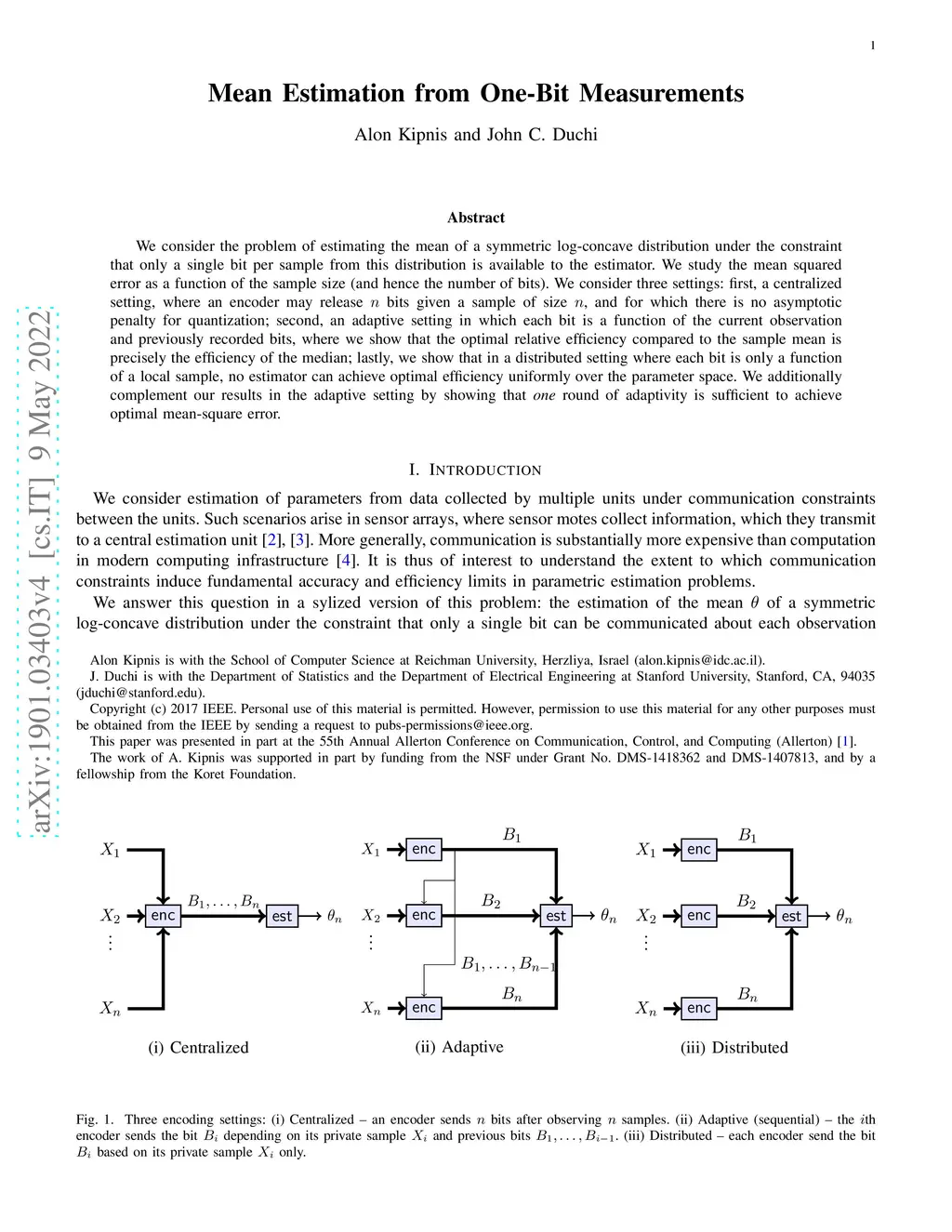 We consider the problem of estimating the mean of a symmetric log-concave distribution under the constraint that only a single bit per sample from this distribution is available to the estimator. We study the mean squared error as a function of the sample size (and hence the number of bits). We consider three settings: first, a centralized setting, where an encoder may release bits given a sample of size , and for which there is no asymptotic penalty for quantization; second, an adaptive setting in which each bit is a function of the current observation and previously recorded bits, where we show that the optimal relative efficiency compared to the sample mean is precisely the efficiency of the median; lastly, we show that in a distributed setting where each bit is only a function of a local sample, no estimator can achieve optimal efficiency uniformly over the parameter space. We additionally complement our results in the adaptive setting by showing that \emph{one} round of adaptivity is sufficient to achieve optimal mean-square error.