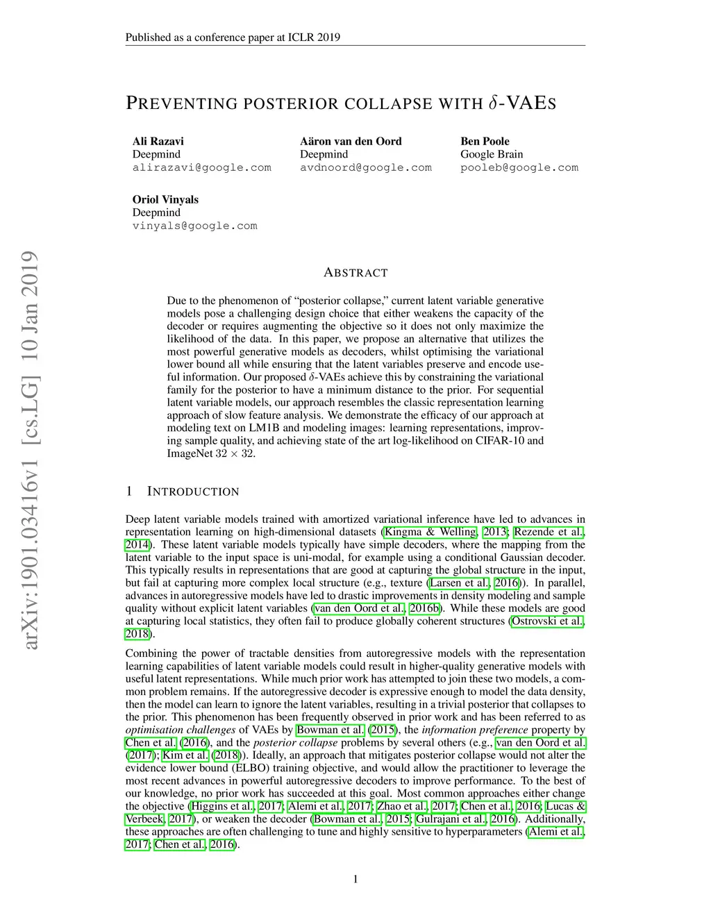 Due to the phenomenon of "posterior collapse," current latent variable generative models pose a challenging design choice that either weakens the capacity of the decoder or requires augmenting the objective so it does not only maximize the likelihood of the data. In this paper, we propose an alternative that utilizes the most powerful generative models as decoders, whilst optimising the variational lower bound all while ensuring that the latent variables preserve and encode useful information. Our proposed -VAEs achieve this by constraining the variational family for the posterior to have a minimum distance to the prior. For sequential latent variable models, our approach resembles the classic representation learning approach of slow feature analysis. We demonstrate the efficacy of our approach at modeling text on LM1B and modeling images: learning representations, improving sample quality, and achieving state of the art log-likelihood on CIFAR-10 and ImageNet .