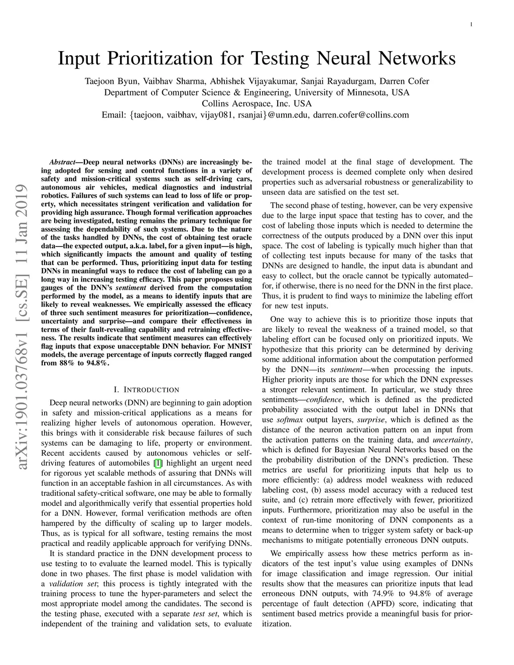 Deep neural networks (DNNs) are increasingly being adopted for sensing and control functions in a variety of safety and mission-critical systems such as self-driving cars, autonomous air vehicles, medical diagnostics, and industrial robotics. Failures of such systems can lead to loss of life or property, which necessitates stringent verification and validation for providing high assurance. Though formal verification approaches are being investigated, testing remains the primary technique for assessing the dependability of such systems. Due to the nature of the tasks handled by DNNs, the cost of obtaining test oracle data---the expected output, a.k.a. label, for a given input---is high, which significantly impacts the amount and quality of testing that can be performed. Thus, prioritizing input data for testing DNNs in meaningful ways to reduce the cost of labeling can go a long way in increasing testing efficacy. This paper proposes using gauges of the DNN's sentiment derived from the computation performed by the model, as a means to identify inputs that are likely to reveal weaknesses. We empirically assessed the efficacy of three such sentiment measures for prioritization---confidence, uncertainty, and surprise---and compare their effectiveness in terms of their fault-revealing capability and retraining effectiveness. The results indicate that sentiment measures can effectively flag inputs that expose unacceptable DNN behavior. For MNIST models, the average percentage of inputs correctly flagged ranged from 88% to 94.8%.