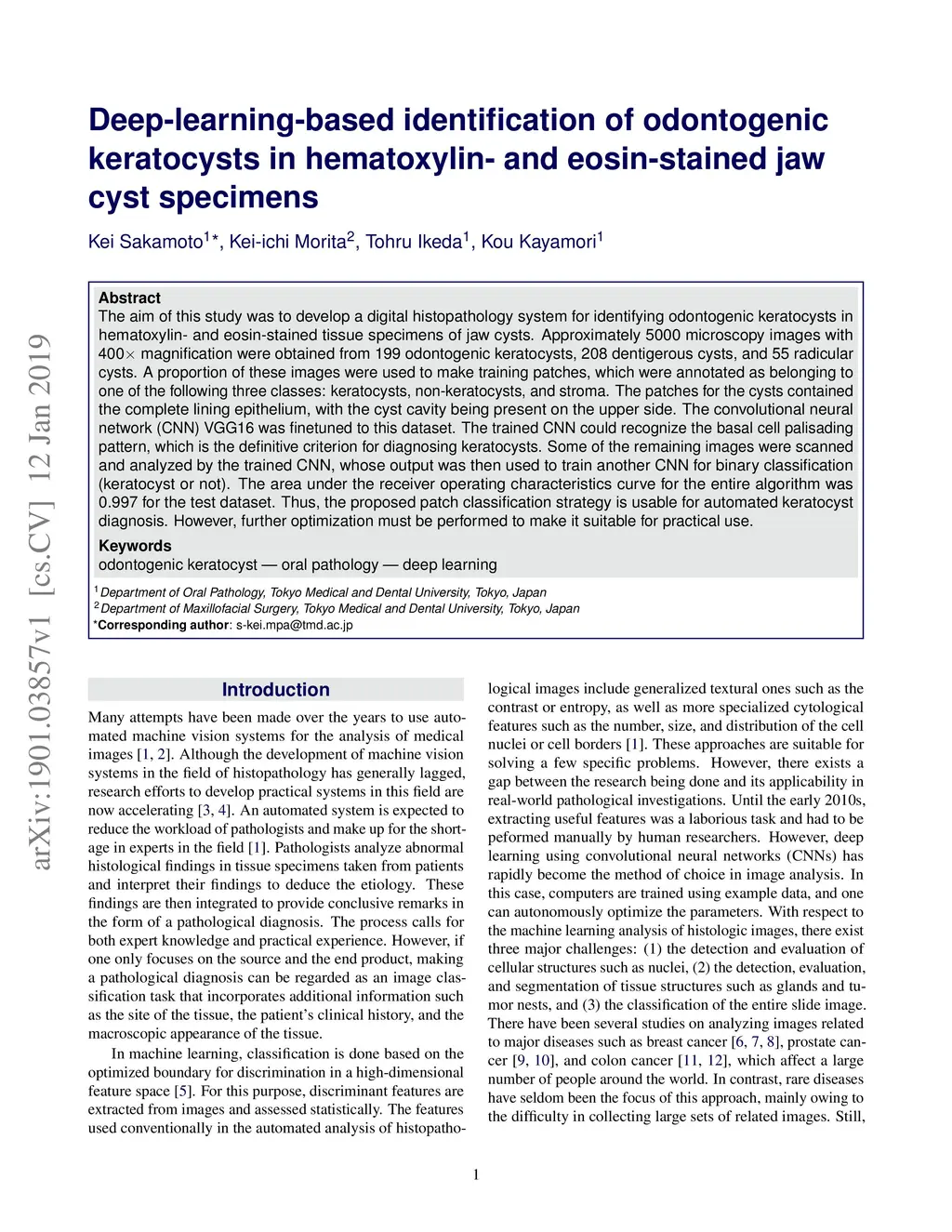 The aim of this study was to develop a digital histopathology system for identifying odontogenic keratocysts in hematoxylin- and eosin-stained tissue specimens of jaw cysts. Approximately 5000 microscopy images with 400 magnification were obtained from 199 odontogenic keratocysts, 208 dentigerous cysts, and 55 radicular cysts. A proportion of these images were used to make training patches, which were annotated as belonging to one of the following three classes: keratocysts, non-keratocysts, and stroma. The patches for the cysts contained the complete lining epithelium, with the cyst cavity being present on the upper side. The convolutional neural network (CNN) VGG16 was finetuned to this dataset. The trained CNN could recognize the basal cell palisading pattern, which is the definitive criterion for diagnosing keratocysts. Some of the remaining images were scanned and analyzed by the trained CNN, whose output was then used to train another CNN for binary classification (keratocyst or not). The area under the receiver operating characteristics curve for the entire algorithm was 0.997 for the test dataset. Thus, the proposed patch classification strategy is usable for automated keratocyst diagnosis. However, further optimization must be performed to make it suitable for practical use.