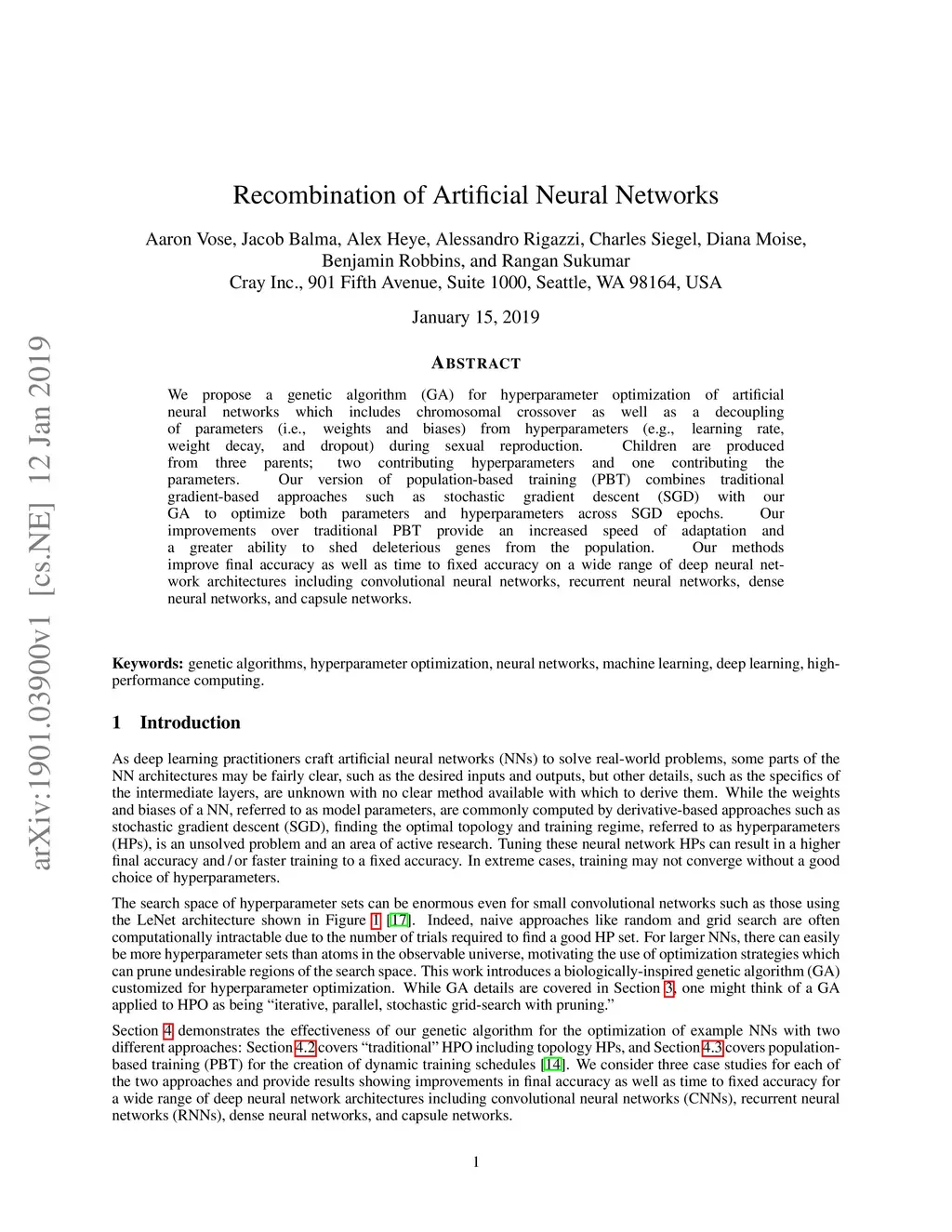 We propose a genetic algorithm (GA) for hyperparameter optimization of artificial neural networks which includes chromosomal crossover as well as a decoupling of parameters (i.e., weights and biases) from hyperparameters (e.g., learning rate, weight decay, and dropout) during sexual reproduction. Children are produced from three parents; two contributing hyperparameters and one contributing the parameters. Our version of population-based training (PBT) combines traditional gradient-based approaches such as stochastic gradient descent (SGD) with our GA to optimize both parameters and hyperparameters across SGD epochs. Our improvements over traditional PBT provide an increased speed of adaptation and a greater ability to shed deleterious genes from the population. Our methods improve final accuracy as well as time to fixed accuracy on a wide range of deep neural network architectures including convolutional neural networks, recurrent neural networks, dense neural networks, and capsule networks.