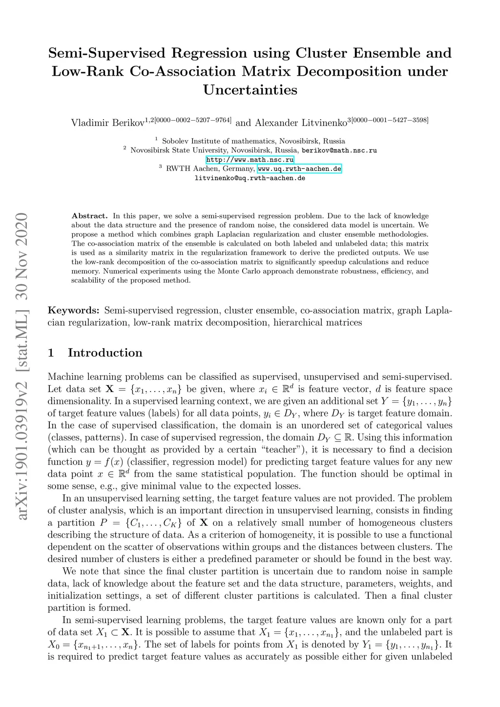 In this paper, we solve a semi-supervised regression problem. Due to the lack of knowledge about the data structure and the presence of random noise, the considered data model is uncertain. We propose a method which combines graph Laplacian regularization and cluster ensemble methodologies. The co-association matrix of the ensemble is calculated on both labeled and unlabeled data; this matrix is used as a similarity matrix in the regularization framework to derive the predicted outputs. We use the low-rank decomposition of the co-association matrix to significantly speedup calculations and reduce memory. Numerical experiments using the Monte Carlo approach demonstrate robustness, efficiency, and scalability of the proposed method.