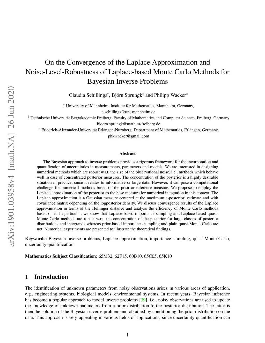 The Bayesian approach to inverse problems provides a rigorous framework for the incorporation and quantification of uncertainties in measurements, parameters and models. We are interested in designing numerical methods which are robust w.r.t. the size of the observational noise, i.e., methods which behave well in case of concentrated posterior measures. The concentration of the posterior is a highly desirable situation in practice, since it relates to informative or large data. However, it can pose a computational challenge for numerical methods based on the prior or reference measure. We propose to employ the Laplace approximation of the posterior as the base measure for numerical integration in this context. The Laplace approximation is a Gaussian measure centered at the maximum a-posteriori estimate and with covariance matrix depending on the logposterior density. We discuss convergence results of the Laplace approximation in terms of the Hellinger distance and analyze the efficiency of Monte Carlo methods based on it. In particular, we show that Laplace-based importance sampling and Laplace-based quasi-Monte-Carlo methods are robust w.r.t. the concentration of the posterior for large classes of posterior distributions and integrands whereas prior-based importance sampling and plain quasi-Monte Carlo are not. Numerical experiments are presented to illustrate the theoretical findings.