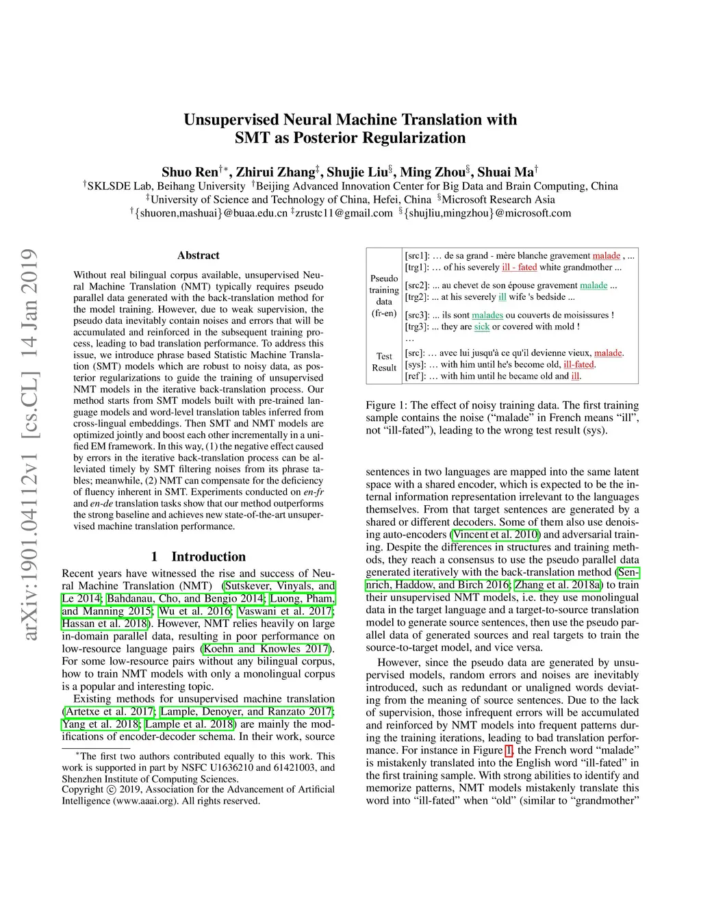 Without real bilingual corpus available, unsupervised Neural Machine Translation (NMT) typically requires pseudo parallel data generated with the back-translation method for the model training. However, due to weak supervision, the pseudo data inevitably contain noises and errors that will be accumulated and reinforced in the subsequent training process, leading to bad translation performance. To address this issue, we introduce phrase based Statistic Machine Translation (SMT) models which are robust to noisy data, as posterior regularizations to guide the training of unsupervised NMT models in the iterative back-translation process. Our method starts from SMT models built with pre-trained language models and word-level translation tables inferred from cross-lingual embeddings. Then SMT and NMT models are optimized jointly and boost each other incrementally in a unified EM framework. In this way, (1) the negative effect caused by errors in the iterative back-translation process can be alleviated timely by SMT filtering noises from its phrase tables; meanwhile, (2) NMT can compensate for the deficiency of fluency inherent in SMT. Experiments conducted on en-fr and en-de translation tasks show that our method outperforms the strong baseline and achieves new state-of-the-art unsupervised machine translation performance.