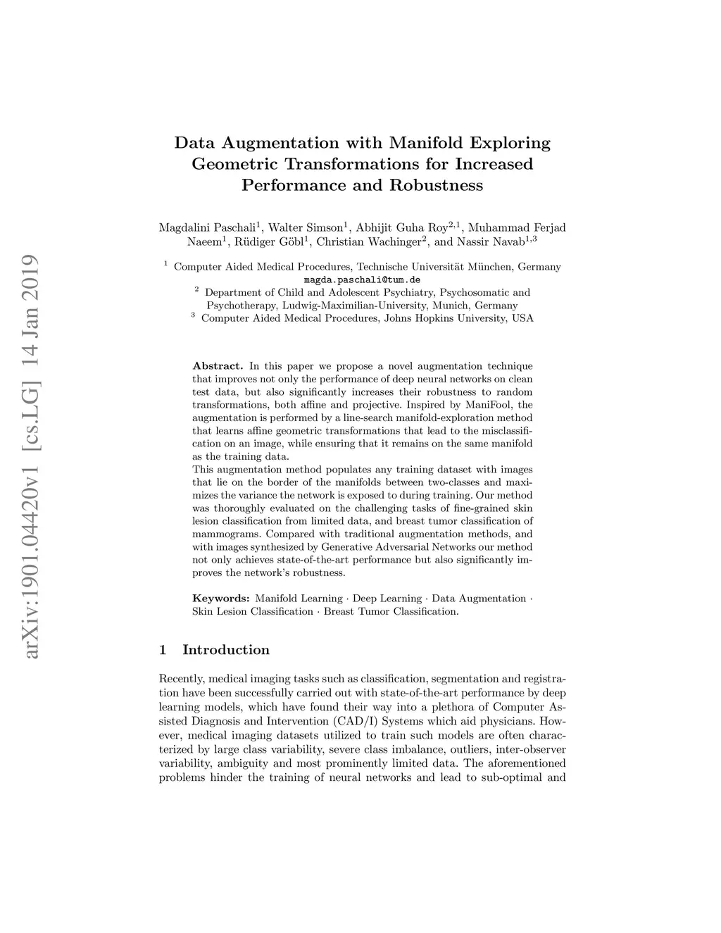 In this paper we propose a novel augmentation technique that improves not only the performance of deep neural networks on clean test data, but also significantly increases their robustness to random transformations, both affine and projective. Inspired by ManiFool, the augmentation is performed by a line-search manifold-exploration method that learns affine geometric transformations that lead to the misclassification on an image, while ensuring that it remains on the same manifold as the training data. This augmentation method populates any training dataset with images that lie on the border of the manifolds between two-classes and maximizes the variance the network is exposed to during training. Our method was thoroughly evaluated on the challenging tasks of fine-grained skin lesion classification from limited data, and breast tumor classification of mammograms. Compared with traditional augmentation methods, and with images synthesized by Generative Adversarial Networks our method not only achieves state-of-the-art performance but also significantly improves the network's robustness.