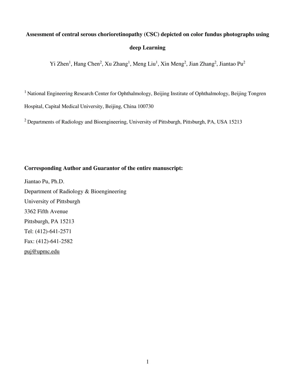 To investigate whether and to what extent central serous chorioretinopathy (CSC) depicted on color fundus photographs can be assessed using deep learning technology. We collected a total of 2,504 fundus images acquired on different subjects. We verified the CSC status of these images using their corresponding optical coherence tomography (OCT) images. A total of 1,329 images depicted CSC. These images were preprocessed and normalized. This resulting dataset was randomly split into three parts in the ratio of 8:1:1 respectively for training, validation, and testing purposes. We used the deep learning architecture termed InceptionV3 to train the classifier. We performed nonparametric receiver operating characteristic (ROC) analyses to assess the capability of the developed algorithm to identify CSC. The Kappa coefficient between the two raters was 0.48 (p < 0.001), while the Kappa coefficients between the computer and the two raters were 0.59 (p < 0.001) and 0.33 (p < 0.05).Our experiments showed that the computer algorithm based on deep learning can assess CSC depicted on color fundus photographs in a relatively reliable and consistent way.