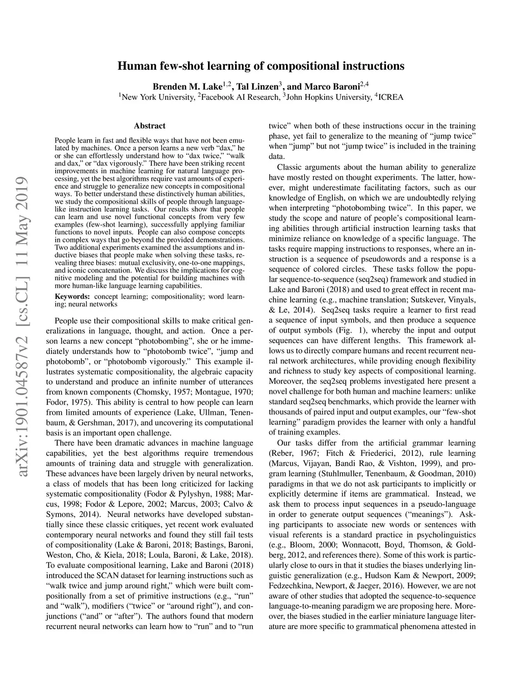 People learn in fast and flexible ways that have not been emulated by machines. Once a person learns a new verb "dax," he or she can effortlessly understand how to "dax twice," "walk and dax," or "dax vigorously." There have been striking recent improvements in machine learning for natural language processing, yet the best algorithms require vast amounts of experience and struggle to generalize new concepts in compositional ways. To better understand these distinctively human abilities, we study the compositional skills of people through language-like instruction learning tasks. Our results show that people can learn and use novel functional concepts from very few examples (few-shot learning), successfully applying familiar functions to novel inputs. People can also compose concepts in complex ways that go beyond the provided demonstrations. Two additional experiments examined the assumptions and inductive biases that people make when solving these tasks, revealing three biases: mutual exclusivity, one-to-one mappings, and iconic concatenation. We discuss the implications for cognitive modeling and the potential for building machines with more human-like language learning capabilities.