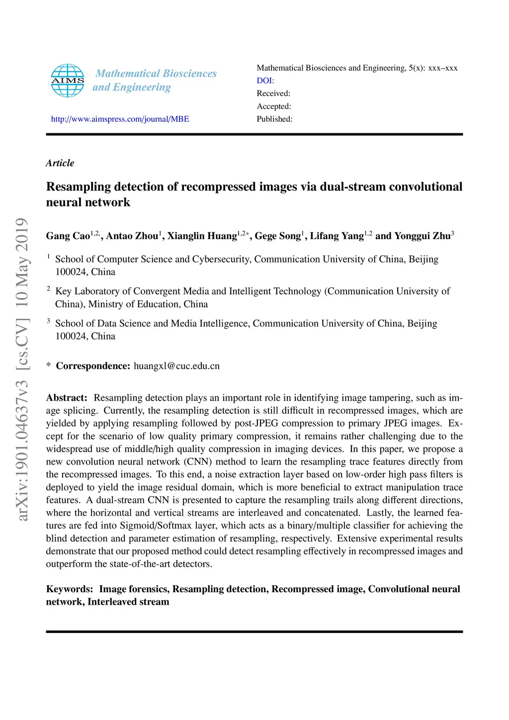 Resampling detection plays an important role in identifying image tampering, such as image splicing. Currently, the resampling detection is still difficult in recompressed images, which are yielded by applying resampling followed by post-JPEG compression to primary JPEG images. Except for the scenario of low quality primary compression, it remains rather challenging due to the widespread use of middle/high quality compression in imaging devices. In this paper, we propose a new convolution neural network (CNN) method to learn the resampling trace features directly from the recompressed images. To this end, a noise extraction layer based on low-order high pass filters is deployed to yield the image residual domain, which is more beneficial to extract manipulation trace features. A dual-stream CNN is presented to capture the resampling trails along different directions, where the horizontal and vertical streams are interleaved and concatenated. Lastly, the learned features are fed into Sigmoid/Softmax layer, which acts as a binary/multiple classifier for achieving the blind detection and parameter estimation of resampling, respectively. Extensive experimental results demonstrate that our proposed method could detect resampling effectively in recompressed images and outperform the state-of-the-art detectors.