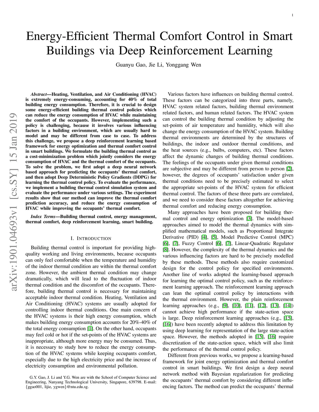 Energy-Efficient Thermal Comfort Control in Smart Buildings via Deep