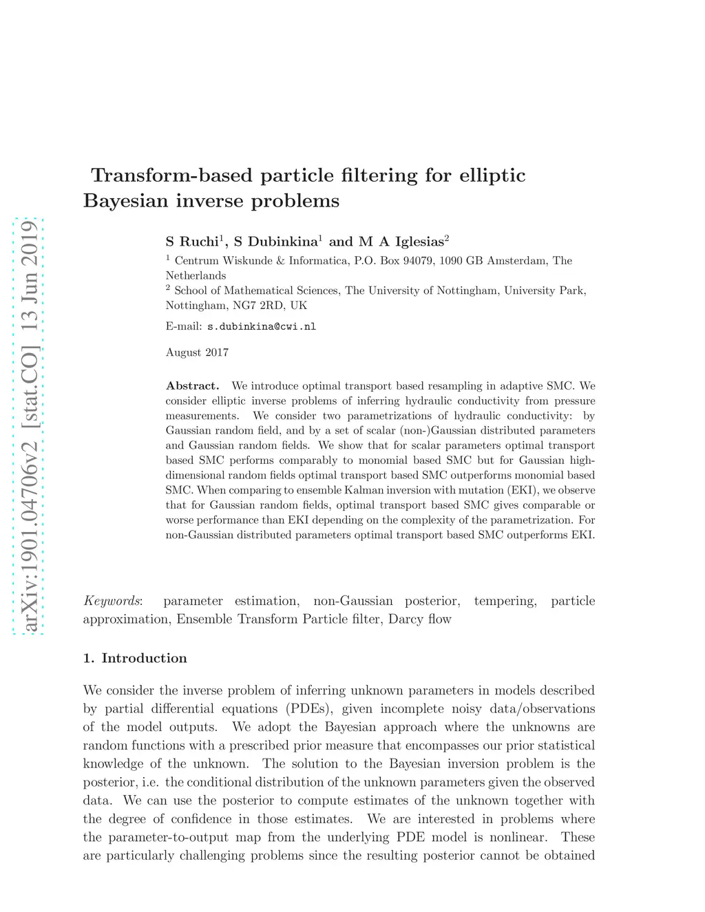 We introduce optimal transport based resampling in adaptive SMC. We consider elliptic inverse problems of inferring hydraulic conductivity from pressure measurements. We consider two parametrizations of hydraulic conductivity: by Gaussian random field, and by a set of scalar (non-)Gaussian distributed parameters and Gaussian random fields. We show that for scalar parameters optimal transport based SMC performs comparably to monomial based SMC but for Gaussian high-dimensional random fields optimal transport based SMC outperforms monomial based SMC. When comparing to ensemble Kalman inversion with mutation (EKI), we observe that for Gaussian random fields, optimal transport based SMC gives comparable or worse performance than EKI depending on the complexity of the parametrization. For non-Gaussian distributed parameters optimal transport based SMC outperforms EKI.