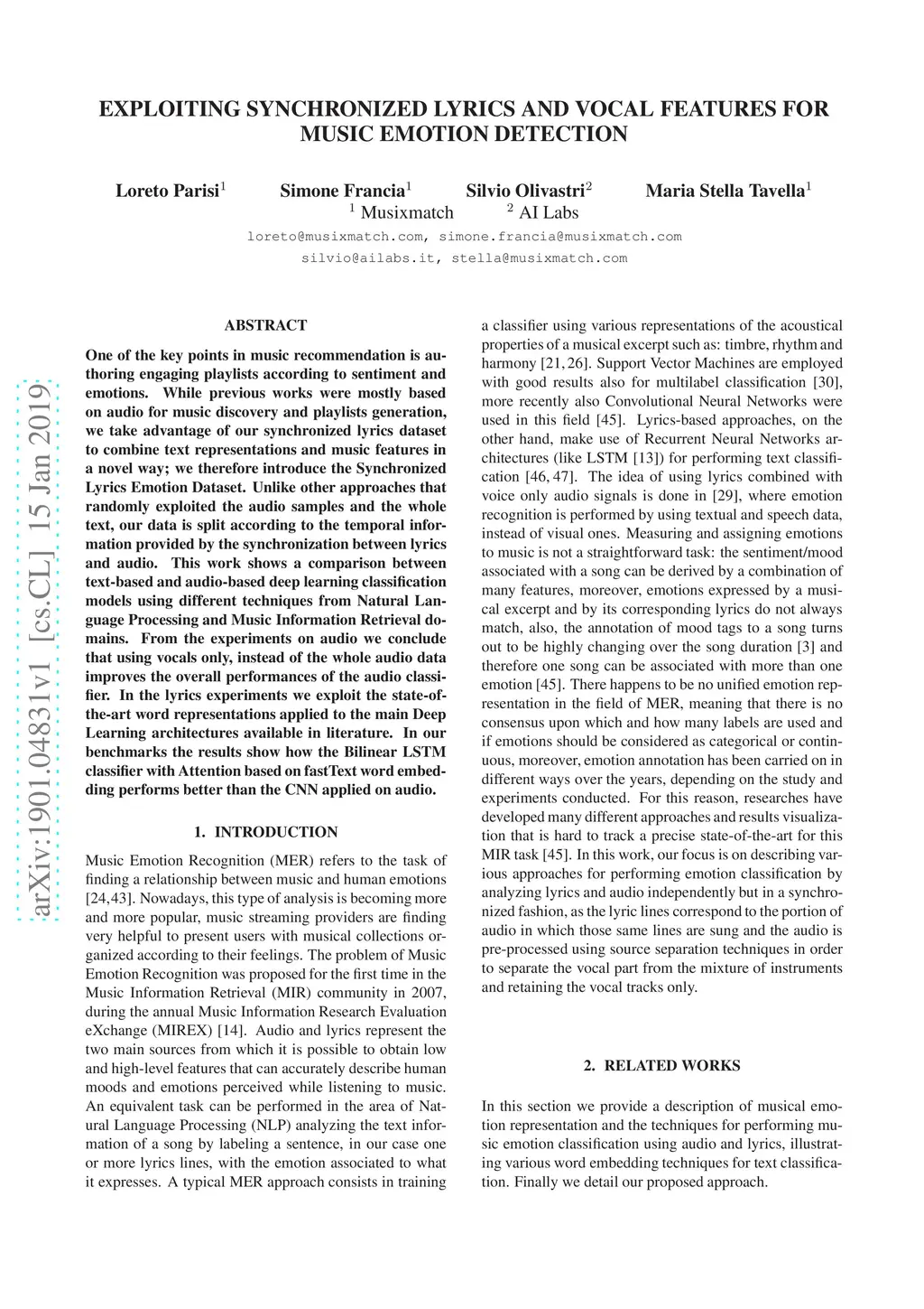 One of the key points in music recommendation is authoring engaging playlists according to sentiment and emotions. While previous works were mostly based on audio for music discovery and playlists generation, we take advantage of our synchronized lyrics dataset to combine text representations and music features in a novel way; we therefore introduce the Synchronized Lyrics Emotion Dataset. Unlike other approaches that randomly exploited the audio samples and the whole text, our data is split according to the temporal information provided by the synchronization between lyrics and audio. This work shows a comparison between text-based and audio-based deep learning classification models using different techniques from Natural Language Processing and Music Information Retrieval domains. From the experiments on audio we conclude that using vocals only, instead of the whole audio data improves the overall performances of the audio classifier. In the lyrics experiments we exploit the state-of-the-art word representations applied to the main Deep Learning architectures available in literature. In our benchmarks the results show how the Bilinear LSTM classifier with Attention based on fastText word embedding performs better than the CNN applied on audio.