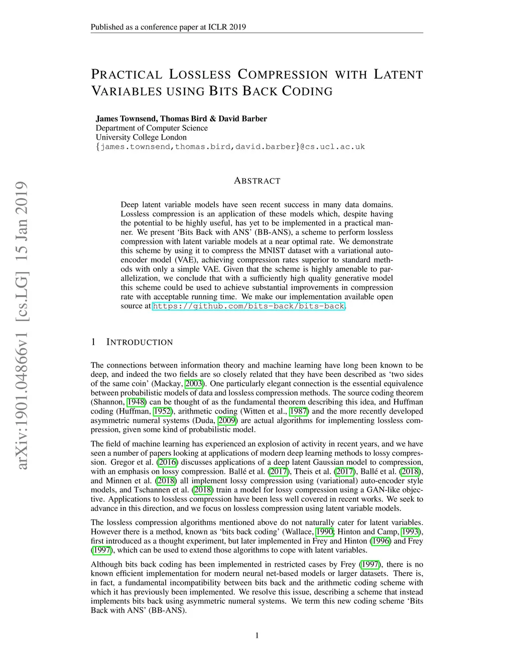 Deep latent variable models have seen recent success in many data domains. Lossless compression is an application of these models which, despite having the potential to be highly useful, has yet to be implemented in a practical manner. We present `Bits Back with ANS' (BB-ANS), a scheme to perform lossless compression with latent variable models at a near optimal rate. We demonstrate this scheme by using it to compress the MNIST dataset with a variational auto-encoder model (VAE), achieving compression rates superior to standard methods with only a simple VAE. Given that the scheme is highly amenable to parallelization, we conclude that with a sufficiently high quality generative model this scheme could be used to achieve substantial improvements in compression rate with acceptable running time. We make our implementation available open source at https://github.com/bits-back/bits-back .