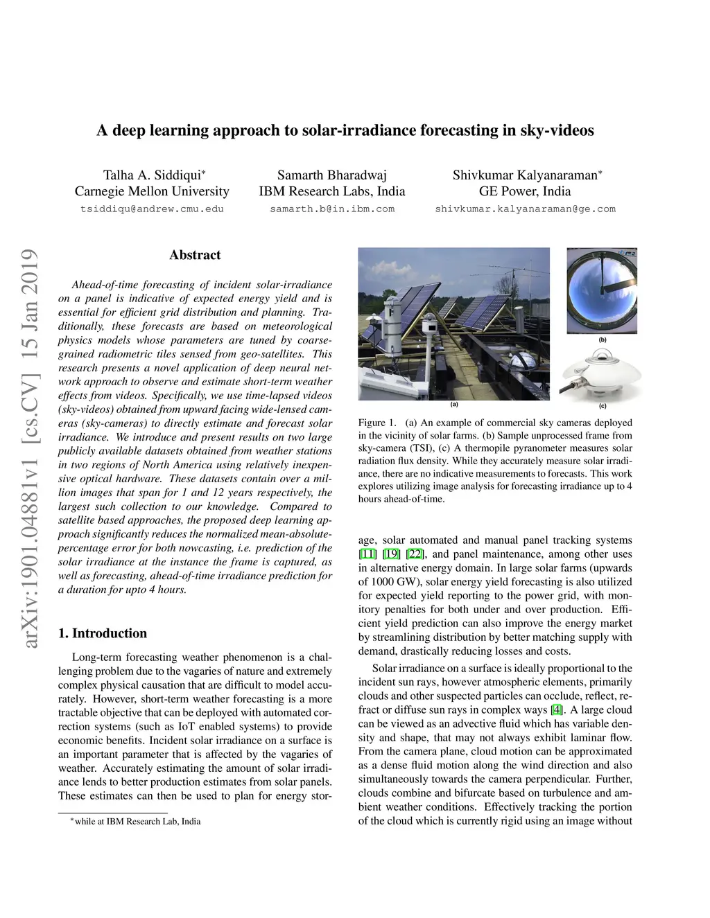 Ahead-of-time forecasting of incident solar-irradiance on a panel is indicative of expected energy yield and is essential for efficient grid distribution and planning. Traditionally, these forecasts are based on meteorological physics models whose parameters are tuned by coarse-grained radiometric tiles sensed from geo-satellites. This research presents a novel application of deep neural network approach to observe and estimate short-term weather effects from videos. Specifically, we use time-lapsed videos (sky-videos) obtained from upward facing wide-lensed cameras (sky-cameras) to directly estimate and forecast solar irradiance. We introduce and present results on two large publicly available datasets obtained from weather stations in two regions of North America using relatively inexpensive optical hardware. These datasets contain over a million images that span for 1 and 12 years respectively, the largest such collection to our knowledge. Compared to satellite based approaches, the proposed deep learning approach significantly reduces the normalized mean-absolute-percentage error for both nowcasting, i.e. prediction of the solar irradiance at the instance the frame is captured, as well as forecasting, ahead-of-time irradiance prediction for a duration for upto 4 hours.