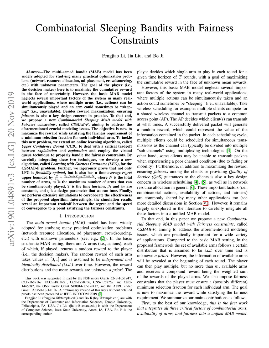 The multi-armed bandit (MAB) model has been widely adopted for studying many practical optimization problems (network resource allocation, ad placement, crowdsourcing, etc.) with unknown parameters. The goal of the player here is to maximize the cumulative reward in the face of uncertainty. However, the basic MAB model neglects several important factors of the system in many real-world applications, where multiple arms can be simultaneously played and an arm could sometimes be "sleeping". Besides, ensuring fairness is also a key design concern in practice. To that end, we propose a new Combinatorial Sleeping MAB model with Fairness constraints, called CSMAB-F, aiming to address the aforementioned crucial modeling issues. The objective is now to maximize the reward while satisfying the fairness requirement of a minimum selection fraction for each individual arm. To tackle this new problem, we extend an online learning algorithm, UCB, to deal with a critical tradeoff between exploitation and exploration and employ the virtual queue technique to properly handle the fairness constraints. By carefully integrating these two techniques, we develop a new algorithm, called Learning with Fairness Guarantee (LFG), for the CSMAB-F problem. Further, we rigorously prove that not only LFG is feasibility-optimal, but it also has a time-average regret upper bounded by , where N is the total number of arms, m is the maximum number of arms that can be simultaneously played, T is the time horizon, and are constants, and is a design parameter that we can tune. Finally, we perform extensive simulations to corroborate the effectiveness of the proposed algorithm. Interestingly, the simulation results reveal an important tradeoff between the regret and the speed of convergence to a point satisfying the fairness constraints.