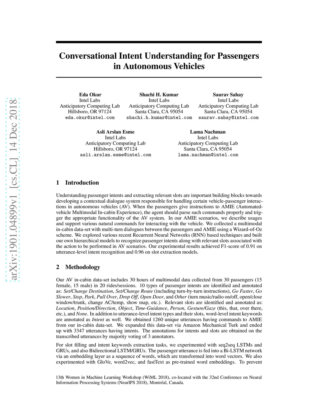 Understanding passenger intents and extracting relevant slots are important building blocks towards developing a contextual dialogue system responsible for handling certain vehicle-passenger interactions in autonomous vehicles (AV). When the passengers give instructions to AMIE (Automated-vehicle Multimodal In-cabin Experience), the agent should parse such commands properly and trigger the appropriate functionality of the AV system. In our AMIE scenarios, we describe usages and support various natural commands for interacting with the vehicle. We collected a multimodal in-cabin data-set with multi-turn dialogues between the passengers and AMIE using a Wizard-of-Oz scheme. We explored various recent Recurrent Neural Networks (RNN) based techniques and built our own hierarchical models to recognize passenger intents along with relevant slots associated with the action to be performed in AV scenarios. Our experimental results achieved F1-score of 0.91 on utterance-level intent recognition and 0.96 on slot extraction models.