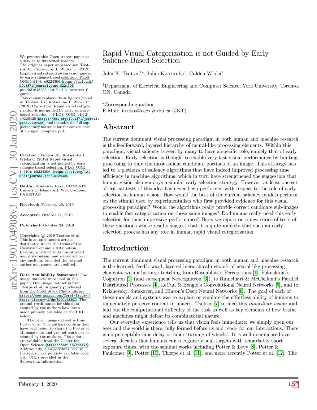 The current dominant visual processing paradigm in both human and machine research is the feedforward, layered hierarchy of neural-like processing elements. Within this paradigm, visual saliency is seen by many to have a specific role, namely that of early selection. Early selection is thought to enable very fast visual performance by limiting processing to only the most salient candidate portions of an image. This strategy has led to a plethora of saliency algorithms that have indeed improved processing time efficiency in machine algorithms, which in turn have strengthened the suggestion that human vision also employs a similar early selection strategy. However, at least one set of critical tests of this idea has never been performed with respect to the role of early selection in human vision. How would the best of the current saliency models perform on the stimuli used by experimentalists who first provided evidence for this visual processing paradigm? Would the algorithms really provide correct candidate sub-images to enable fast categorization on those same images? Do humans really need this early selection for their impressive performance? Here, we report on a new series of tests of these questions whose results suggest that it is quite unlikely that such an early selection process has any role in human rapid visual categorization.