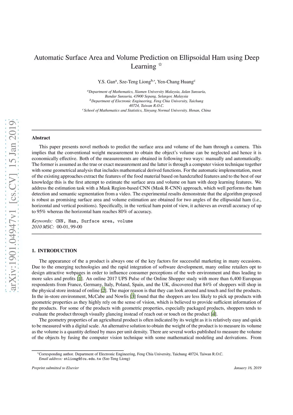 This paper presents novel methods to predict the surface and volume of the ham through a camera. This implies that the conventional weight measurement to obtain in the object's volume can be neglected and hence it is economically effective. Both of the measurements are obtained in the following two ways: manually and automatically. The former is assume as the true or exact measurement and the latter is through a computer vision technique with some geometrical analysis that includes mathematical derived functions. For the automatic implementation, most of the existing approaches extract the features of the food material based on handcrafted features and to the best of our knowledge this is the first attempt to estimate the surface area and volume on ham with deep learning features. We address the estimation task with a Mask Region-based CNN (Mask R-CNN) approach, which well performs the ham detection and semantic segmentation from a video. The experimental results demonstrate that the algorithm proposed is robust as promising surface area and volume estimation are obtained for two angles of the ellipsoidal ham (i.e., horizontal and vertical positions). Specifically, in the vertical ham point of view, it achieves an overall accuracy up to 95% whereas the horizontal ham reaches 80% of accuracy.