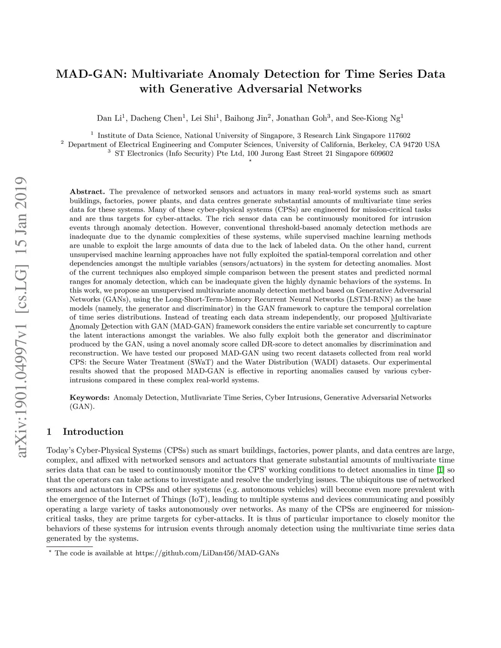 MAD-GAN: Multivariate Anomaly Detection for Time Series Data with
