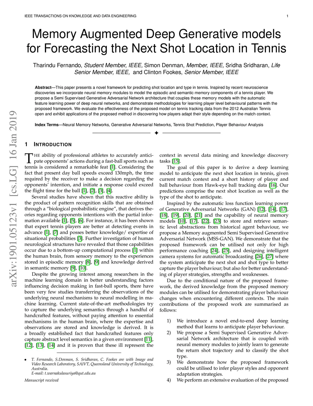 This paper presents a novel framework for predicting shot location and type in tennis. Inspired by recent neuroscience discoveries we incorporate neural memory modules to model the episodic and semantic memory components of a tennis player. We propose a Semi Supervised Generative Adversarial Network architecture that couples these memory models with the automatic feature learning power of deep neural networks and demonstrate methodologies for learning player level behavioural patterns with the proposed framework. We evaluate the effectiveness of the proposed model on tennis tracking data from the 2012 Australian Tennis open and exhibit applications of the proposed method in discovering how players adapt their style depending on the match context.