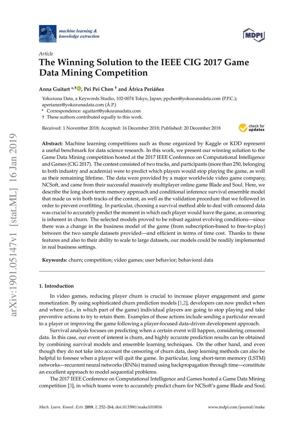 Machine learning competitions such as those organized by Kaggle or KDD represent a useful benchmark for data science research. In this work, we present our winning solution to the Game Data Mining competition hosted at the 2017 IEEE Conference on Computational Intelligence and Games (CIG 2017). The contest consisted of two tracks, and participants (more than 250, belonging to both industry and academia) were to predict which players would stop playing the game, as well as their remaining lifetime. The data were provided by a major worldwide video game company, NCSoft, and came from their successful massively multiplayer online game Blade and Soul. Here, we describe the long short-term memory approach and conditional inference survival ensemble model that made us win both tracks of the contest, as well as the validation procedure that we followed in order to prevent overfitting. In particular, choosing a survival method able to deal with censored data was crucial to accurately predict the moment in which each player would leave the game, as censoring is inherent in churn. The selected models proved to be robust against evolving conditions---since there was a change in the business model of the game (from subscription-based to free-to-play) between the two sample datasets provided---and efficient in terms of time cost. Thanks to these features and also to their a ability to scale to large datasets, our models could be readily implemented in real business settings.