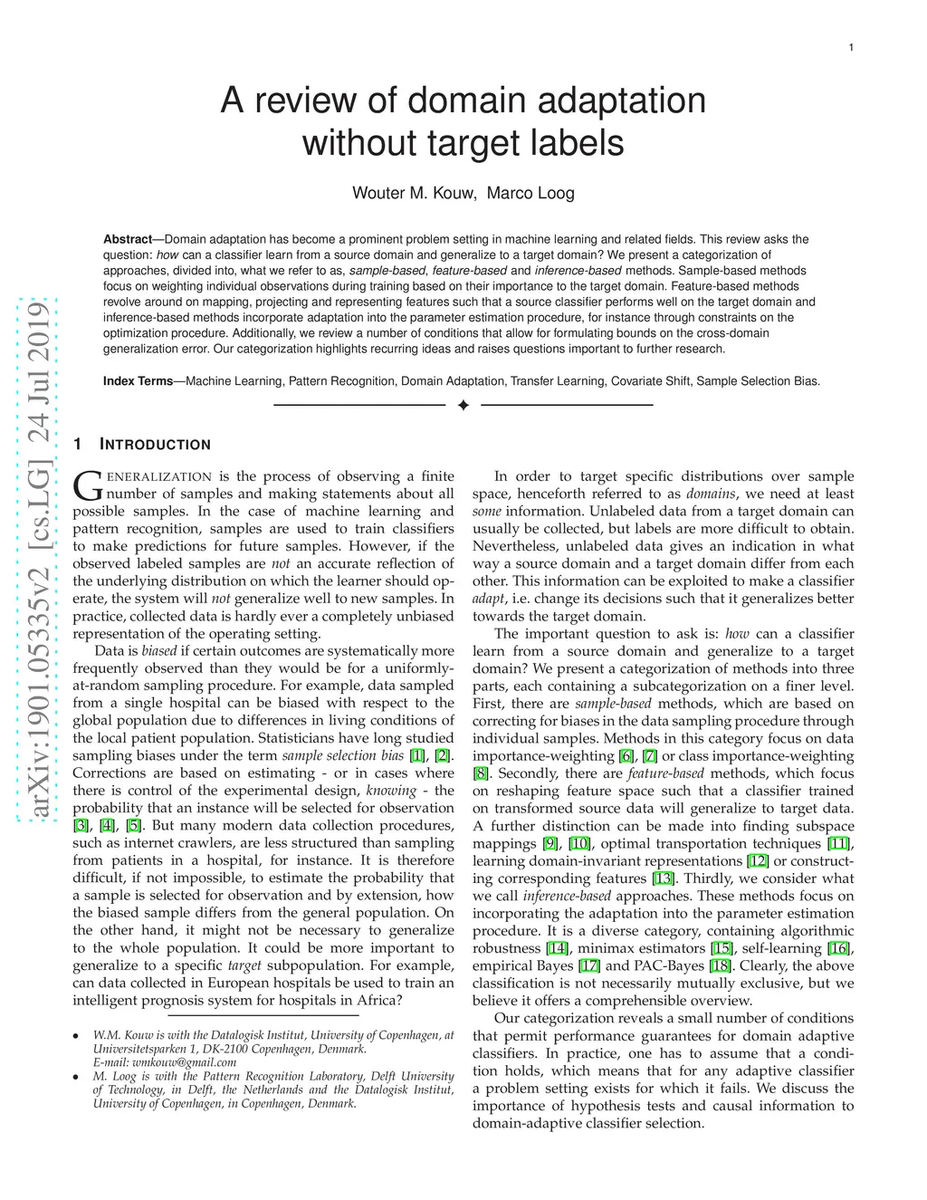 Domain adaptation has become a prominent problem setting in machine learning and related fields. This review asks the question: how can a classifier learn from a source domain and generalize to a target domain? We present a categorization of approaches, divided into, what we refer to as, sample-based, feature-based and inference-based methods. Sample-based methods focus on weighting individual observations during training based on their importance to the target domain. Feature-based methods revolve around on mapping, projecting and representing features such that a source classifier performs well on the target domain and inference-based methods incorporate adaptation into the parameter estimation procedure, for instance through constraints on the optimization procedure. Additionally, we review a number of conditions that allow for formulating bounds on the cross-domain generalization error. Our categorization highlights recurring ideas and raises questions important to further research.