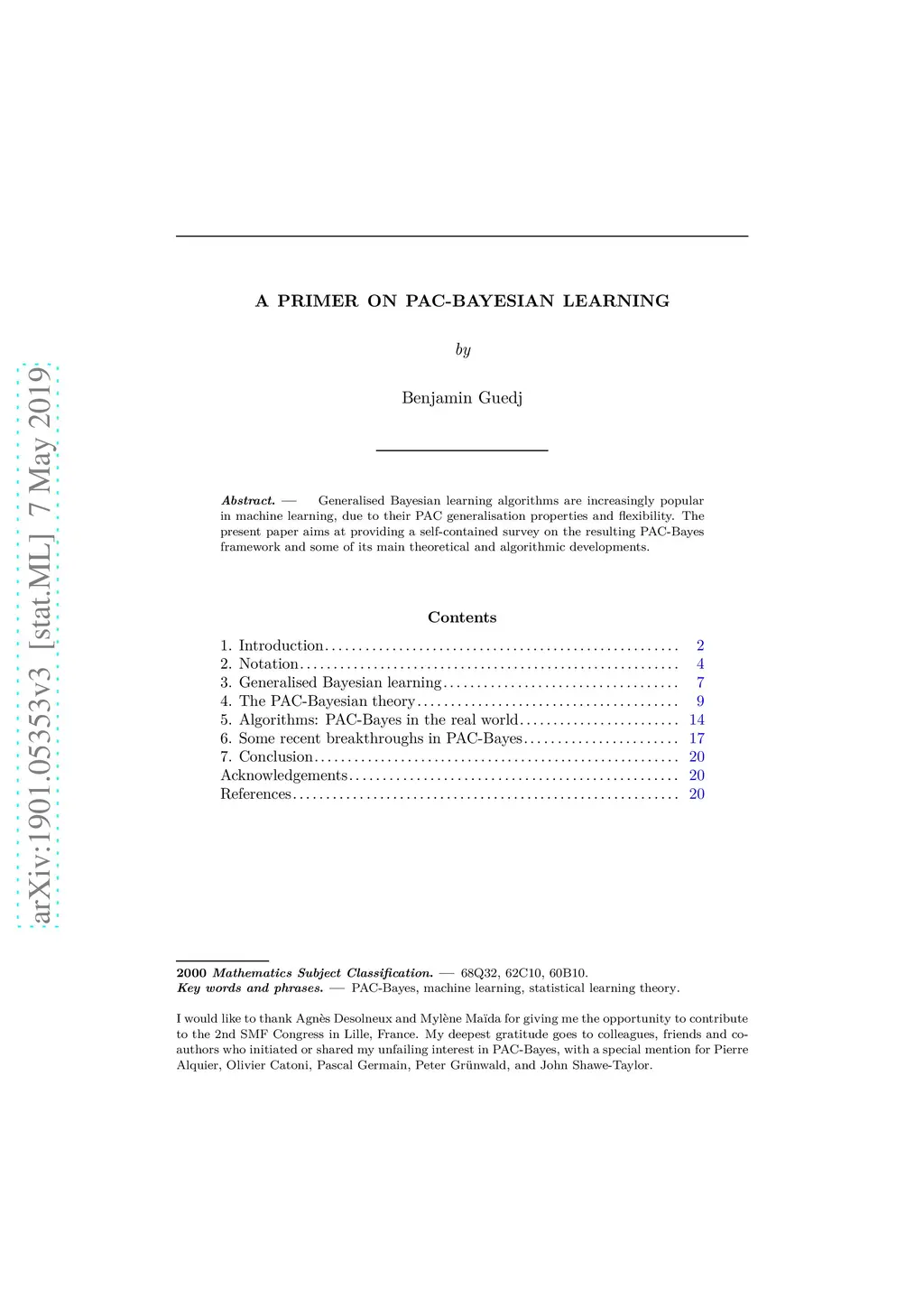 Generalised Bayesian learning algorithms are increasingly popular in machine learning, due to their PAC generalisation properties and flexibility. The present paper aims at providing a self-contained survey on the resulting PAC-Bayes framework and some of its main theoretical and algorithmic developments.