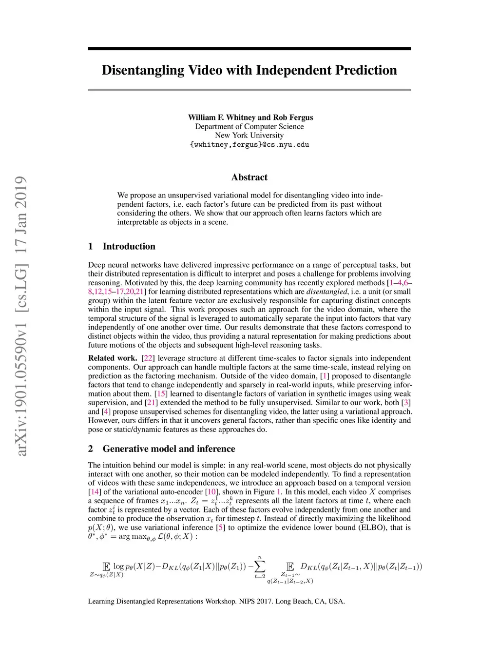 We propose an unsupervised variational model for disentangling video into independent factors, i.e. each factor's future can be predicted from its past without considering the others. We show that our approach often learns factors which are interpretable as objects in a scene.