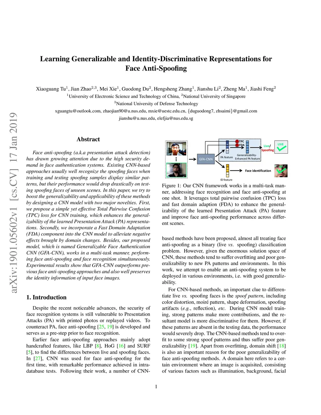 Face anti-spoofing (a.k.a presentation attack detection) has drawn growing attention due to the high-security demand in face authentication systems. Existing CNN-based approaches usually well recognize the spoofing faces when training and testing spoofing samples display similar patterns, but their performance would drop drastically on testing spoofing faces of unseen scenes. In this paper, we try to boost the generalizability and applicability of these methods by designing a CNN model with two major novelties. First, we propose a simple yet effective Total Pairwise Confusion (TPC) loss for CNN training, which enhances the generalizability of the learned Presentation Attack (PA) representations. Secondly, we incorporate a Fast Domain Adaptation (FDA) component into the CNN model to alleviate negative effects brought by domain changes. Besides, our proposed model, which is named Generalizable Face Authentication CNN (GFA-CNN), works in a multi-task manner, performing face anti-spoofing and face recognition simultaneously. Experimental results show that GFA-CNN outperforms previous face anti-spoofing approaches and also well preserves the identity information of input face images.