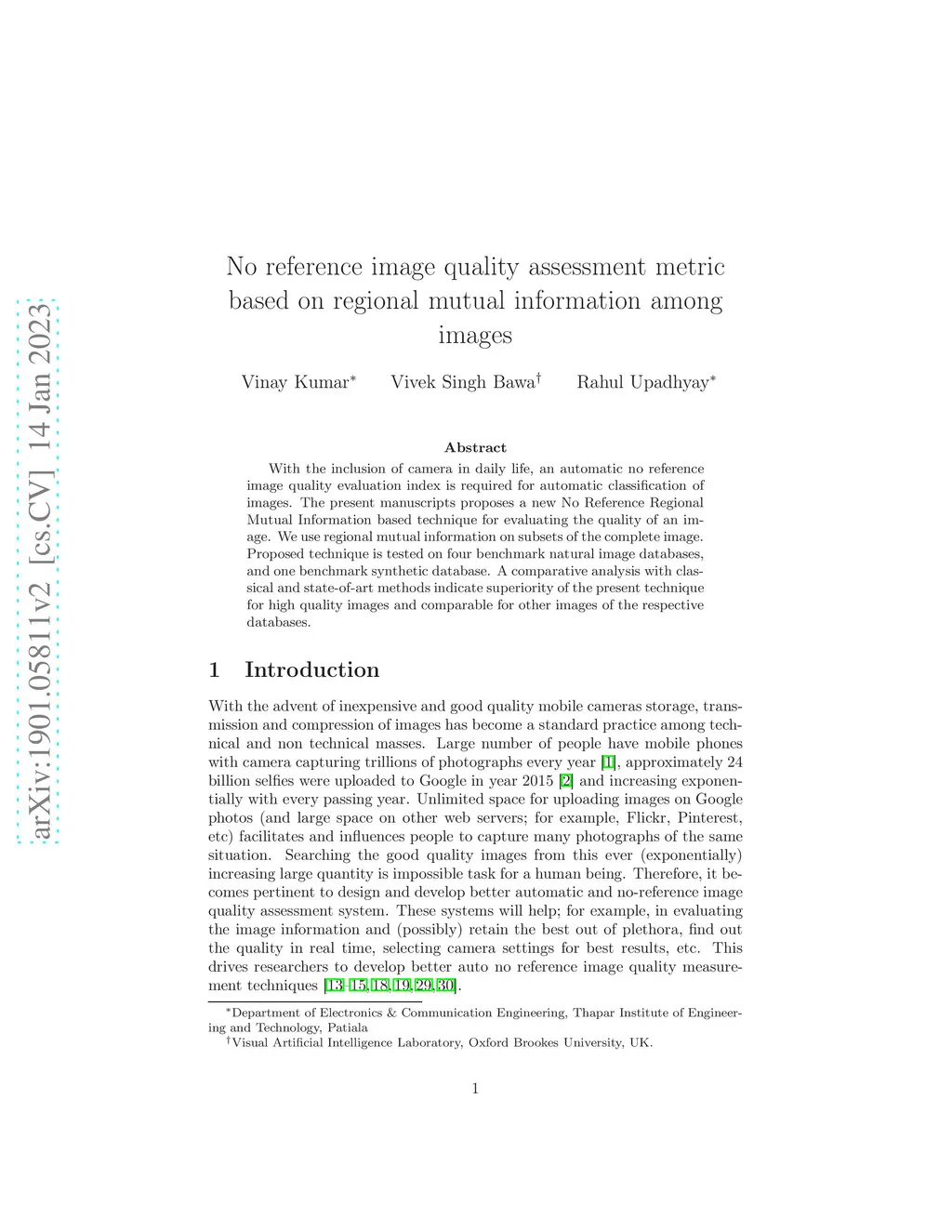 No reference image quality assessment metric based on regional mutual
