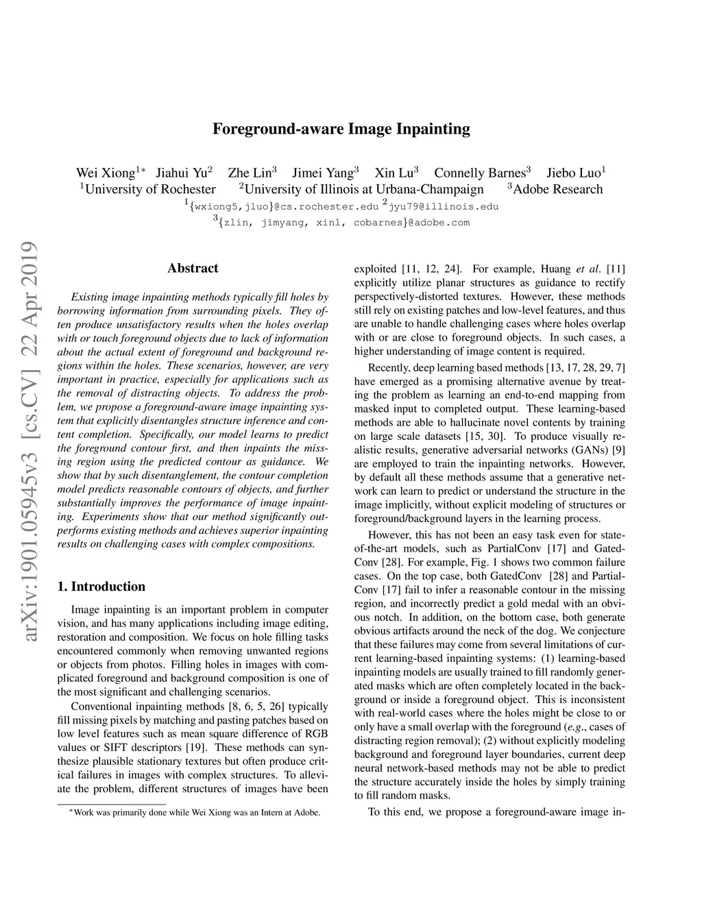 Existing image inpainting methods typically fill holes by borrowing information from surrounding pixels. They often produce unsatisfactory results when the holes overlap with or touch foreground objects due to lack of information about the actual extent of foreground and background regions within the holes. These scenarios, however, are very important in practice, especially for applications such as the removal of distracting objects. To address the problem, we propose a foreground-aware image inpainting system that explicitly disentangles structure inference and content completion. Specifically, our model learns to predict the foreground contour first, and then inpaints the missing region using the predicted contour as guidance. We show that by such disentanglement, the contour completion model predicts reasonable contours of objects, and further substantially improves the performance of image inpainting. Experiments show that our method significantly outperforms existing methods and achieves superior inpainting results on challenging cases with complex compositions.