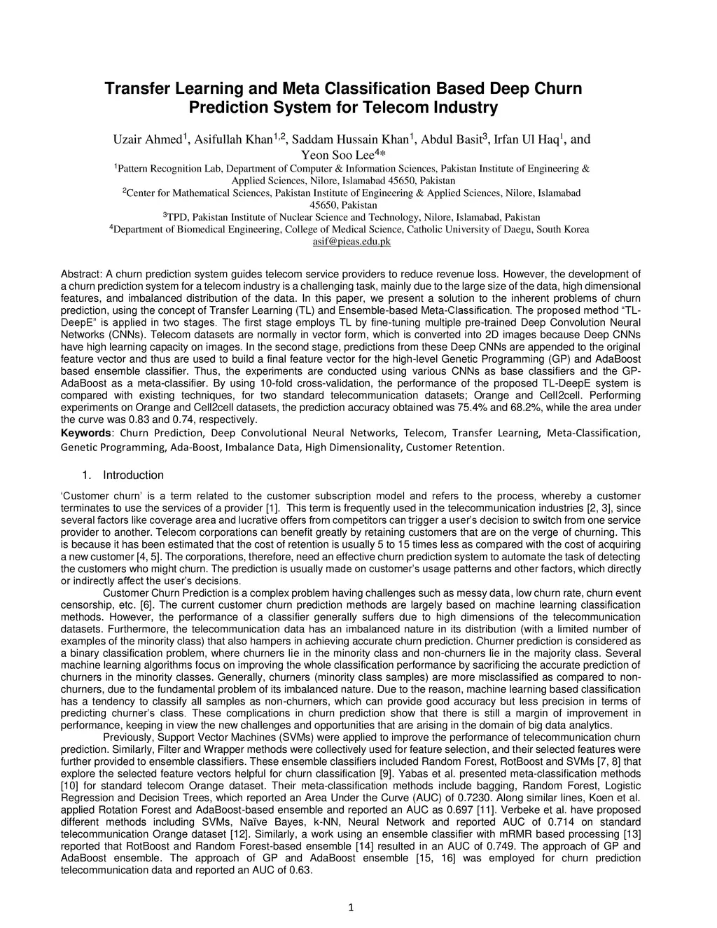 A churn prediction system guides telecom service providers to reduce revenue loss. However, the development of a churn prediction system for a telecom industry is a challenging task, mainly due to the large size of the data, high dimensional features, and imbalanced distribution of the data. In this paper, we present a solution to the inherent problems of churn prediction, using the concept of Transfer Learning (TL) and Ensemble-based Meta-Classification. The proposed method TL-DeepE is applied in two stages. The first stage employs TL by fine-tuning multiple pre-trained Deep Convolution Neural Networks (CNNs). Telecom datasets are normally in vector form, which is converted into 2D images because Deep CNNs have high learning capacity on images. In the second stage, predictions from these Deep CNNs are appended to the original feature vector and thus are used to build a final feature vector for the high-level Genetic Programming (GP) and AdaBoost based ensemble classifier. Thus, the experiments are conducted using various CNNs as base classifiers and the GP-AdaBoost as a meta-classifier. By using 10-fold cross-validation, the performance of the proposed TL-DeepE system is compared with existing techniques, for two standard telecommunication datasets; Orange and Cell2cell. Performing experiments on Orange and Cell2cell datasets, the prediction accuracy obtained was 75.4% and 68.2%, while the area under the curve was 0.83 and 0.74, respectively.
