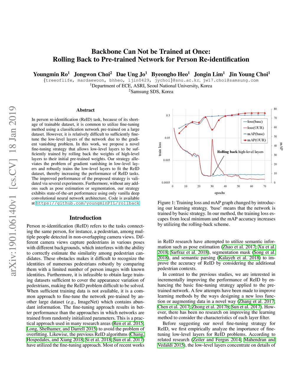 In person re-identification (ReID) task, because of its shortage of trainable dataset, it is common to utilize fine-tuning method using a classification network pre-trained on a large dataset. However, it is relatively difficult to sufficiently fine-tune the low-level layers of the network due to the gradient vanishing problem. In this work, we propose a novel fine-tuning strategy that allows low-level layers to be sufficiently trained by rolling back the weights of high-level layers to their initial pre-trained weights. Our strategy alleviates the problem of gradient vanishing in low-level layers and robustly trains the low-level layers to fit the ReID dataset, thereby increasing the performance of ReID tasks. The improved performance of the proposed strategy is validated via several experiments. Furthermore, without any add-ons such as pose estimation or segmentation, our strategy exhibits state-of-the-art performance using only vanilla deep convolutional neural network architecture.