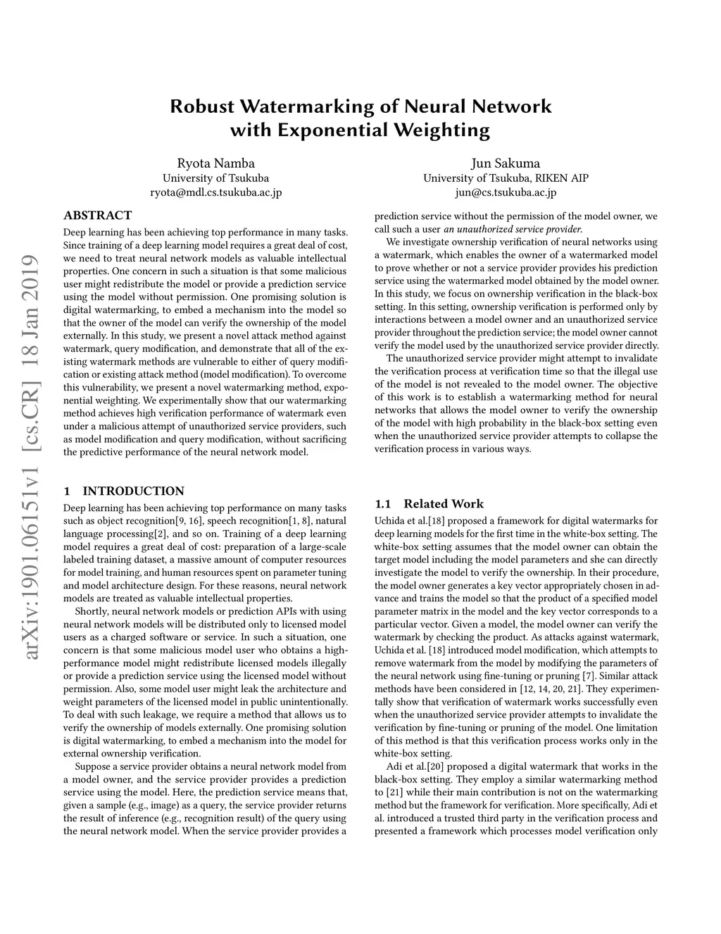 Deep learning has been achieving top performance in many tasks. Since training of a deep learning model requires a great deal of cost, we need to treat neural network models as valuable intellectual properties. One concern in such a situation is that some malicious user might redistribute the model or provide a prediction service using the model without permission. One promising solution is digital watermarking, to embed a mechanism into the model so that the owner of the model can verify the ownership of the model externally. In this study, we present a novel attack method against watermark, query modification, and demonstrate that all of the existing watermark methods are vulnerable to either of query modification or existing attack method (model modification). To overcome this vulnerability, we present a novel watermarking method, exponential weighting. We experimentally show that our watermarking method achieves high verification performance of watermark even under a malicious attempt of unauthorized service providers, such as model modification and query modification, without sacrificing the predictive performance of the neural network model.
