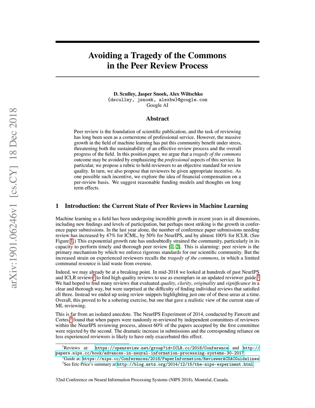 Peer review is the foundation of scientific publication, and the task of reviewing has long been seen as a cornerstone of professional service. However, the massive growth in the field of machine learning has put this community benefit under stress, threatening both the sustainability of an effective review process and the overall progress of the field. In this position paper, we argue that a tragedy of the commons outcome may be avoided by emphasizing the professional aspects of this service. In particular, we propose a rubric to hold reviewers to an objective standard for review quality. In turn, we also propose that reviewers be given appropriate incentive. As one possible such incentive, we explore the idea of financial compensation on a per-review basis. We suggest reasonable funding models and thoughts on long term effects.