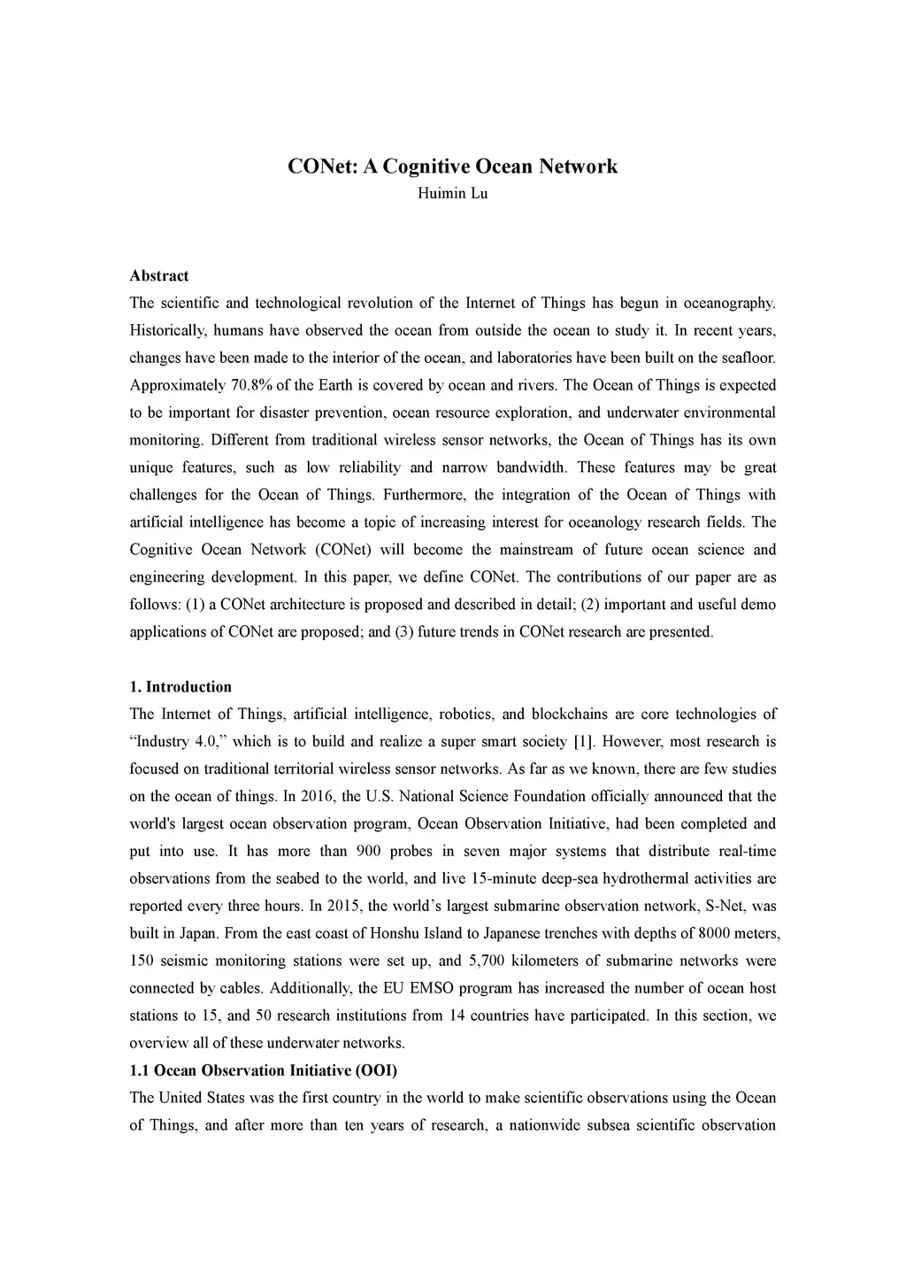 The scientific and technological revolution of the Internet of Things has begun in the area of oceanography. Historically, humans have observed the ocean from an external viewpoint in order to study it. In recent years, however, changes have occurred in the ocean, and laboratories have been built on the seafloor. Approximately 70.8% of the Earth's surface is covered by oceans and rivers. The Ocean of Things is expected to be important for disaster prevention, ocean-resource exploration, and underwater environmental monitoring. Unlike traditional wireless sensor networks, the Ocean Network has its own unique features, such as low reliability and narrow bandwidth. These features will be great challenges for the Ocean Network. Furthermore, the integration of the Ocean Network with artificial intelligence has become a topic of increasing interest for oceanology researchers. The Cognitive Ocean Network (CONet) will become the mainstream of future ocean science and engineering developments. In this article, we define the CONet. The contributions of the paper are as follows: (1) a CONet architecture is proposed and described in detail; (2) important and useful demonstration applications of the CONet are proposed; and (3) future trends in CONet research are presented.