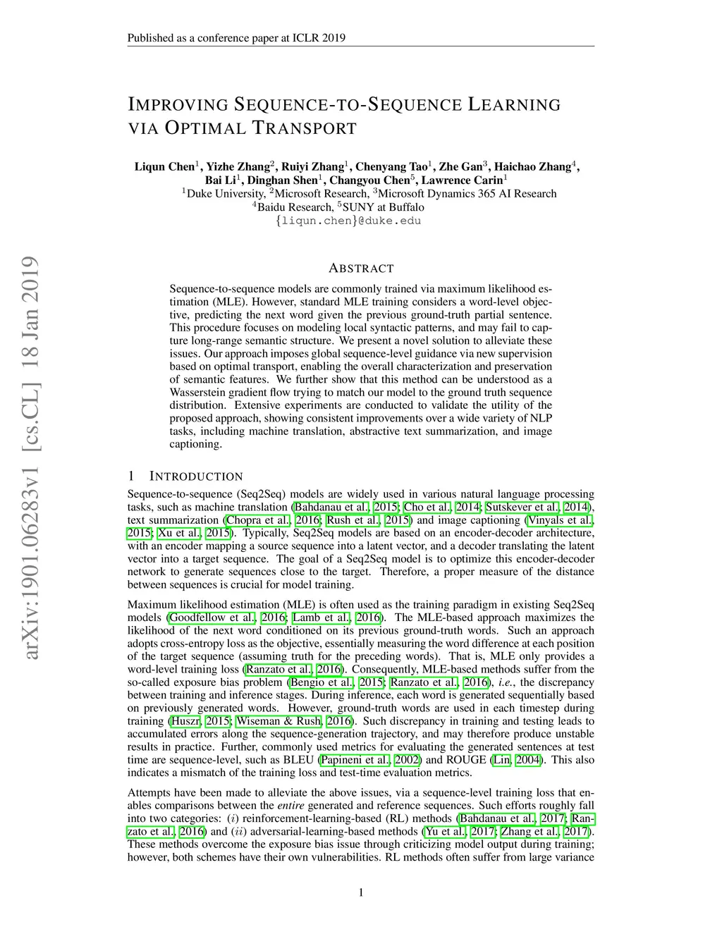 Sequence-to-sequence models are commonly trained via maximum likelihood estimation (MLE). However, standard MLE training considers a word-level objective, predicting the next word given the previous ground-truth partial sentence. This procedure focuses on modeling local syntactic patterns, and may fail to capture long-range semantic structure. We present a novel solution to alleviate these issues. Our approach imposes global sequence-level guidance via new supervision based on optimal transport, enabling the overall characterization and preservation of semantic features. We further show that this method can be understood as a Wasserstein gradient flow trying to match our model to the ground truth sequence distribution. Extensive experiments are conducted to validate the utility of the proposed approach, showing consistent improvements over a wide variety of NLP tasks, including machine translation, abstractive text summarization, and image captioning.