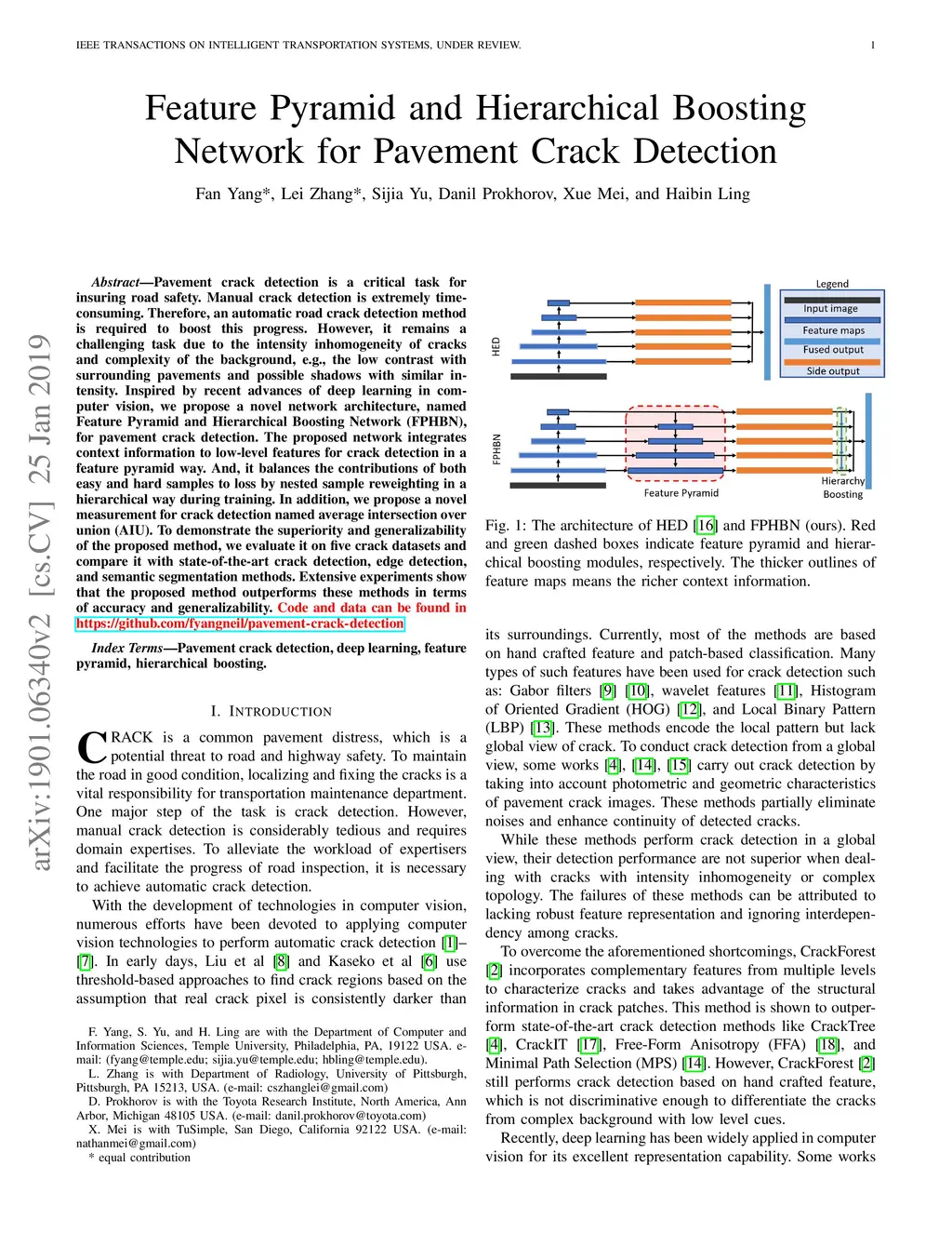 Feature Pyramid and Hierarchical Boosting Network for Pavement Crack Detection