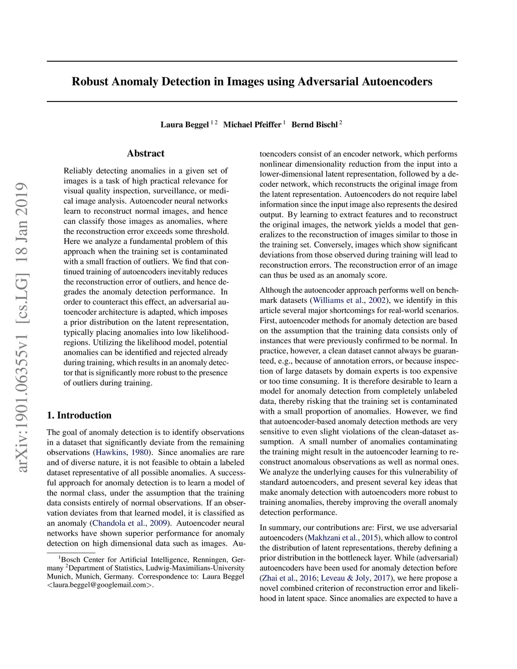Reliably detecting anomalies in a given set of images is a task of high practical relevance for visual quality inspection, surveillance, or medical image analysis. Autoencoder neural networks learn to reconstruct normal images, and hence can classify those images as anomalies, where the reconstruction error exceeds some threshold. Here we analyze a fundamental problem of this approach when the training set is contaminated with a small fraction of outliers. We find that continued training of autoencoders inevitably reduces the reconstruction error of outliers, and hence degrades the anomaly detection performance. In order to counteract this effect, an adversarial autoencoder architecture is adapted, which imposes a prior distribution on the latent representation, typically placing anomalies into low likelihood-regions. Utilizing the likelihood model, potential anomalies can be identified and rejected already during training, which results in an anomaly detector that is significantly more robust to the presence of outliers during training.