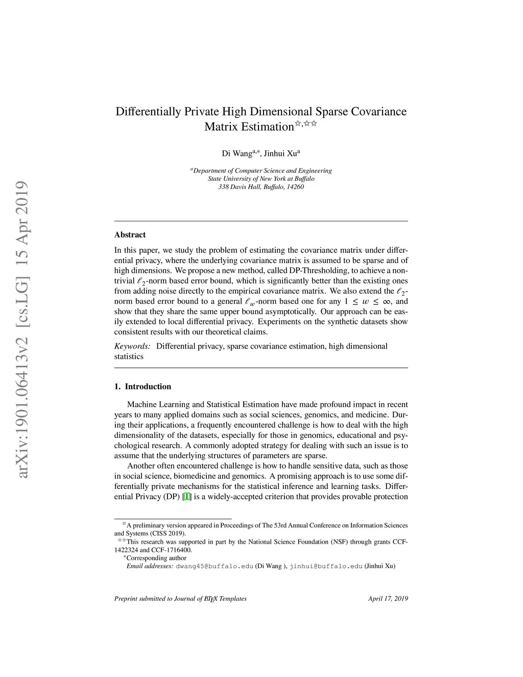 In this paper, we study the problem of estimating the covariance matrix under differential privacy, where the underlying covariance matrix is assumed to be sparse and of high dimensions. We propose a new method, called DP-Thresholding, to achieve a non-trivial -norm based error bound, which is significantly better than the existing ones from adding noise directly to the empirical covariance matrix. We also extend the -norm based error bound to a general -norm based one for any , and show that they share the same upper bound asymptotically. Our approach can be easily extended to local differential privacy. Experiments on the synthetic datasets show consistent results with our theoretical claims.