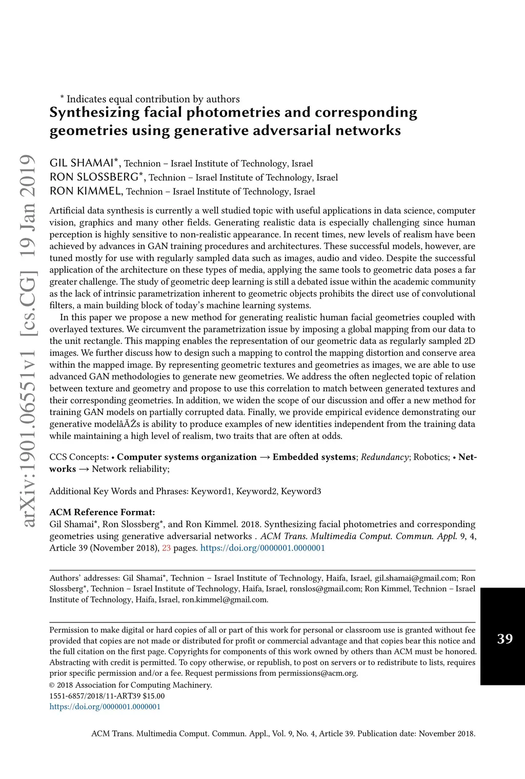Artificial data synthesis is currently a well studied topic with useful applications in data science, computer vision, graphics and many other fields. Generating realistic data is especially challenging since human perception is highly sensitive to non realistic appearance. In recent times, new levels of realism have been achieved by advances in GAN training procedures and architectures. These successful models, however, are tuned mostly for use with regularly sampled data such as images, audio and video. Despite the successful application of the architecture on these types of media, applying the same tools to geometric data poses a far greater challenge. The study of geometric deep learning is still a debated issue within the academic community as the lack of intrinsic parametrization inherent to geometric objects prohibits the direct use of convolutional filters, a main building block of today's machine learning systems. In this paper we propose a new method for generating realistic human facial geometries coupled with overlayed textures. We circumvent the parametrization issue by imposing a global mapping from our data to the unit rectangle. We further discuss how to design such a mapping to control the mapping distortion and conserve area within the mapped image. By representing geometric textures and geometries as images, we are able to use advanced GAN methodologies to generate new geometries. We address the often neglected topic of relation between texture and geometry and propose to use this correlation to match between generated textures and their corresponding geometries. We offer a new method for training GAN models on partially corrupted data. Finally, we provide empirical evidence demonstrating our generative model's ability to produce examples of new identities independent from the training data while maintaining a high level of realism, two traits that are often at odds.