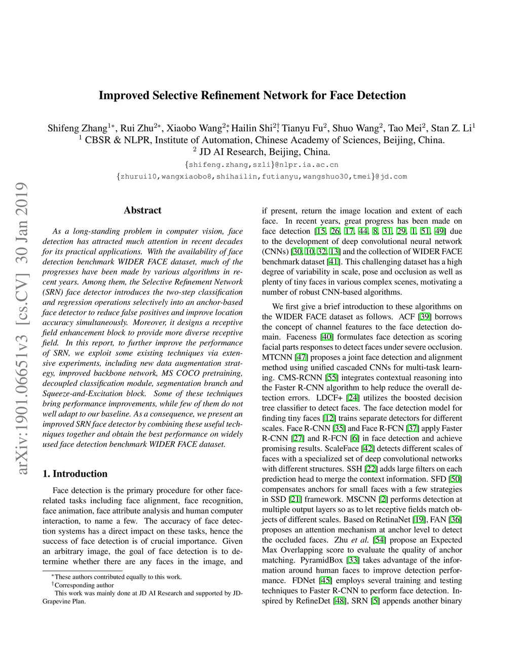 As a long-standing problem in computer vision, face detection has attracted much attention in recent decades for its practical applications. With the availability of face detection benchmark WIDER FACE dataset, much of the progresses have been made by various algorithms in recent years. Among them, the Selective Refinement Network (SRN) face detector introduces the two-step classification and regression operations selectively into an anchor-based face detector to reduce false positives and improve location accuracy simultaneously. Moreover, it designs a receptive field enhancement block to provide more diverse receptive field. In this report, to further improve the performance of SRN, we exploit some existing techniques via extensive experiments, including new data augmentation strategy, improved backbone network, MS COCO pretraining, decoupled classification module, segmentation branch and Squeeze-and-Excitation block. Some of these techniques bring performance improvements, while few of them do not well adapt to our baseline. As a consequence, we present an improved SRN face detector by combining these useful techniques together and obtain the best performance on widely used face detection benchmark WIDER FACE dataset.