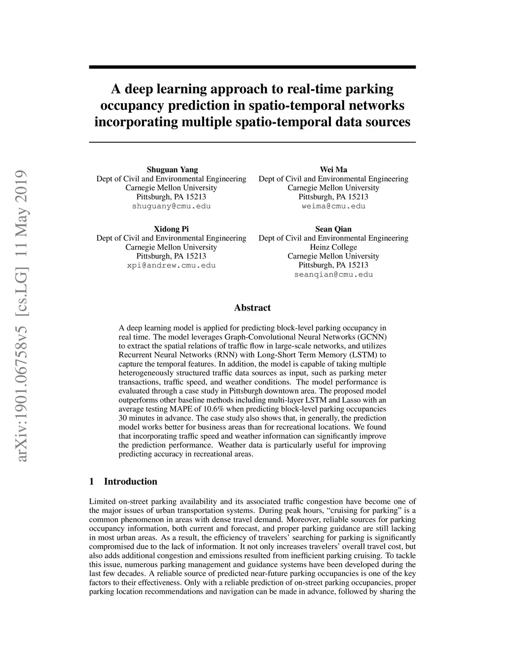 A deep learning model is applied for predicting block-level parking occupancy in real time. The model leverages Graph-Convolutional Neural Networks (GCNN) to extract the spatial relations of traffic flow in large-scale networks, and utilizes Recurrent Neural Networks (RNN) with Long-Short Term Memory (LSTM) to capture the temporal features. In addition, the model is capable of taking multiple heterogeneously structured traffic data sources as input, such as parking meter transactions, traffic speed, and weather conditions. The model performance is evaluated through a case study in Pittsburgh downtown area. The proposed model outperforms other baseline methods including multi-layer LSTM and Lasso with an average testing MAPE of 10.6\% when predicting block-level parking occupancies 30 minutes in advance. The case study also shows that, in generally, the prediction model works better for business areas than for recreational locations. We found that incorporating traffic speed and weather information can significantly improve the prediction performance. Weather data is particularly useful for improving predicting accuracy in recreational areas.